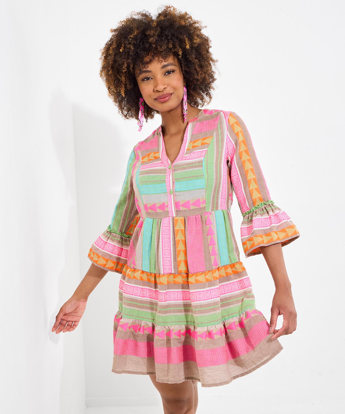 Dieses Minikleid präsentiert sich mit einem lebendigen Jacquard-Muster, das Bohème-Stil mit einer verspielten Silhouette verbindet. Das Design umfasst einen V-Ausschnitt und Dreiviertelärmel mit Rüschenbündchen, die dem Gesamtbild einen charmanten Touch verleihen. Der gestufte Rock sorgt für eine fliessende und bequeme Passform, ideal für verschiedene Anlässe.