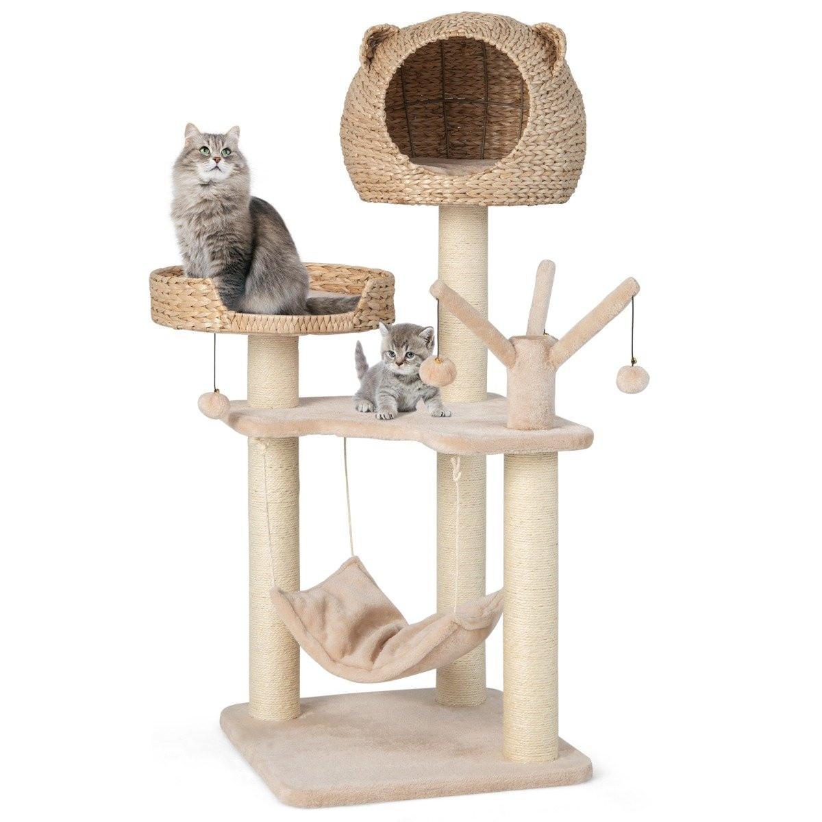 Der Kratzbaum ist mit einer bequemen Hängematte, einer geräumigen Sprungplattform, vier unterhaltsamen Jingle-Bällen, einem großen Katzenbett und einer privaten Katzenhöhle ausgestattet. Ihre Katzen können auch mit den hängenden Fellbällen spielen, um Energie zu verbrauchen, wenn Sie nicht zum Spielen verfügbar sind. Die Katzenhöhle und die Bettgestelle sind mit feiner Handwerkskunst aus natürlichem Schilfrohrflaum gefertigt und bieten Ihren Katzen ein komfortables und erholsames Erlebnis. Sie sind außerdem mit zwei dicken Plüschkissen ausgestattet, die für katzenfreundliche Weichheit und Wärme sorgen.