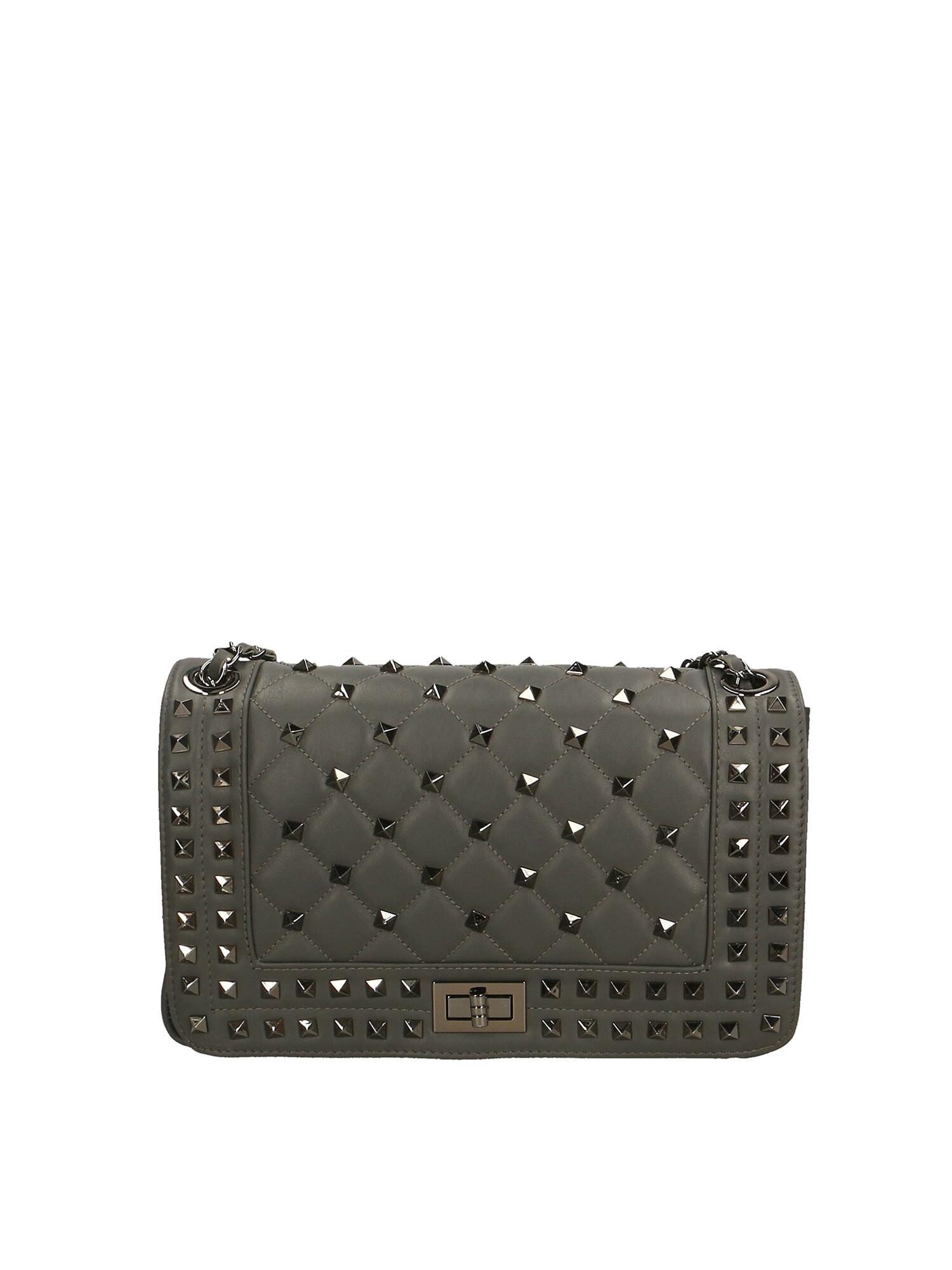 Diese Damen-Umhängetasche verfügt über ein Einzelfach und einen Kettenschulterriemen aus gewebtem Leder. Es ist ein italienisches handgefertigtes Produkt aus echtem gestepptem Sauvage-Leder mit Pyramidennieten.