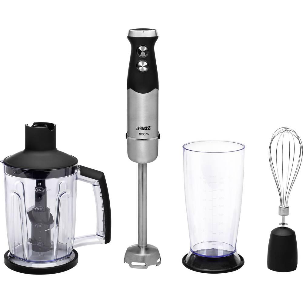 Das extrem leistungsstarke Princess 221221 Stabmixer-Set mit vier Klingen eignet sich perfekt für die Zubereitung von Pestos, Suppen oder Milchshakes. Der Stabmixer hat eine Leistung von 1000 Watt. Wählen Sie eine der fünft Einstellungen, um die gewünschte Leistung des Mixers abzurufen. Einfach zu bedienen Der gummierte Griff mit den beiden beleuchteten Tasten ist ergonomisch geformt und liegt damit perfekt in der Hand. Dank der blauen Anzeige oben am Griff können Sie jederzeit die Leistungsstufe ablesen. Noch nie war die Handhabung eines Stabmixers einfacher. Problemloses Pürieren Der XL-Edelstahlstab mit den vier Klingen püriert Suppen und Früchte im Nu dank des extrem leistungsstarken 1000-W-Motors. Mit dem mitgelieferten 0,8-l-Messbecher können Sie Smoothies, Babynahrung und Pestos zuhause selbst zubereiten, mit dem Schneebesen Schlagsahne schlagen und im XL-Zerkleinerer Kräuter und Zwiebeln häckseln. Einfach zu reinigen Der Stabmixer lässt sich leicht zerlegen, und sowohl der Mixstab als auch die Zubehörteile sind spülmaschinenfest. Damit ist das Reinigen des Stabmixers eine wirklich problemlose Angelegenheit.