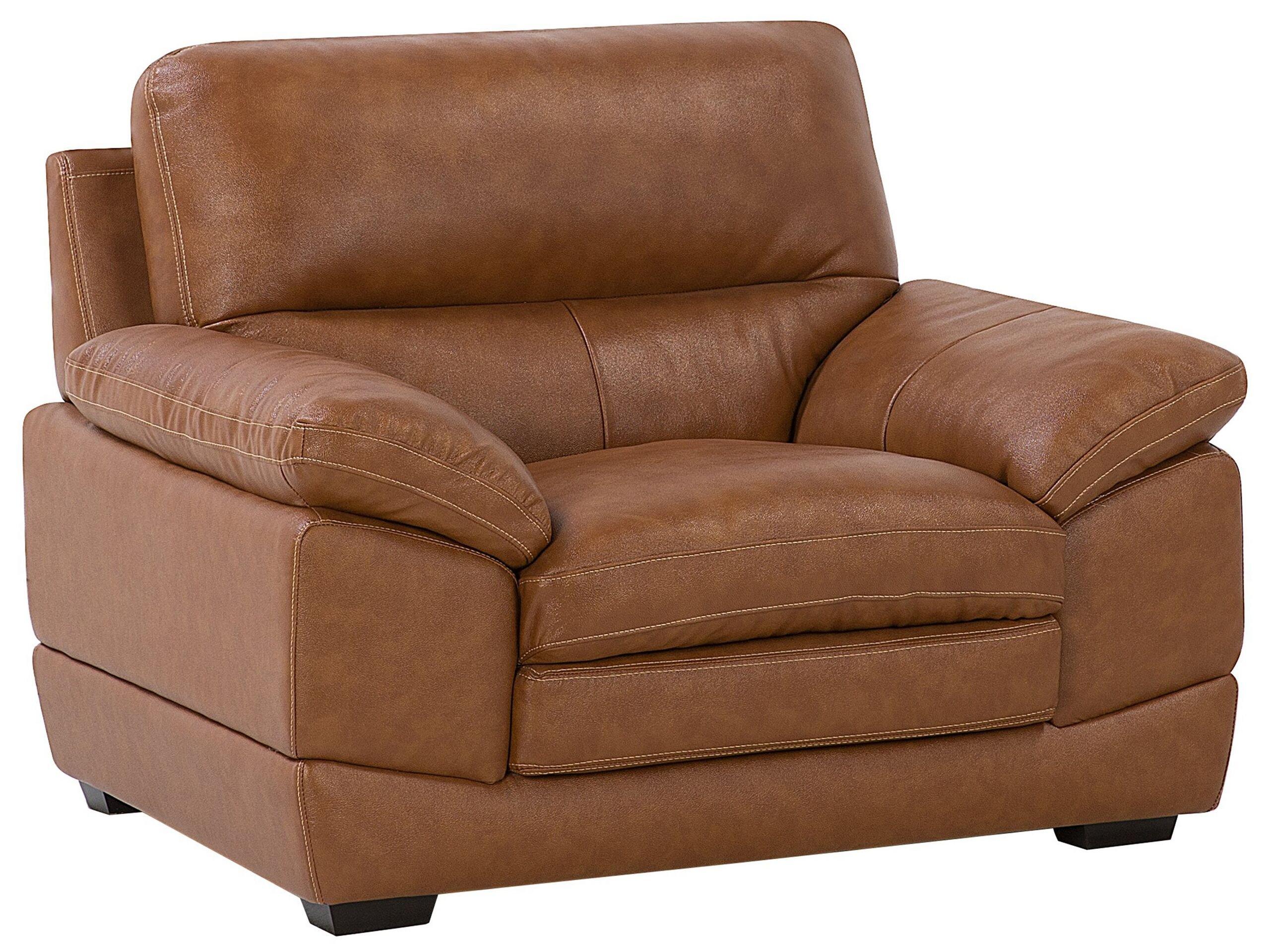 Echtleder Wohnzimmer-Sessel in Goldbraun. Schaffen Sie mit diesem wunderschönen Ledersessel einen eleganten Entspannungsplatz in Ihrem Wohnzimmer. Der breite, tiefe, einladende Sitz aus Echtleder ist aussergewöhnlich komfortabel, während die hochwertige Polsterung eine angenehme Haptik besitzt und leicht in Stand zu halten ist. Sein natürlicher, goldbrauner Farbton passt zu vielen Stilen. Dieser Vielseitigkeit ist es zu verdanken, dass der Sessel jede Einrichtung optimal ergänzen kann.