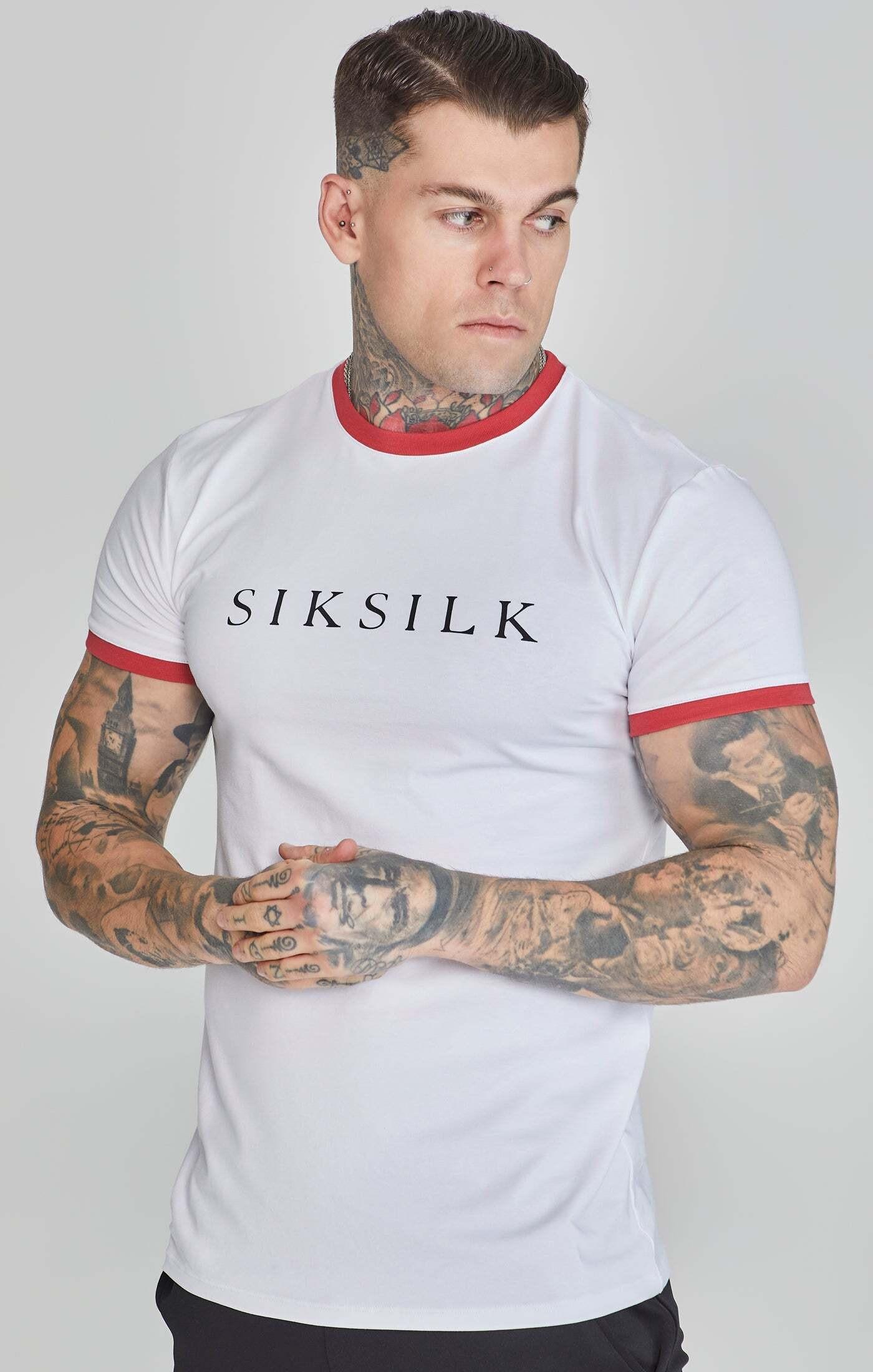 Das Ringer T-Shirt in White/Red von SikSilk kombiniert klassischen Stil mit modernen Details. Mit dem auffälligen Siebdruck-Logo und der körperbetonten Passform bietet es einen markanten Look. Kontrastfarben an Halsausschnitt und Bündchen verleihen dem Shirt einen sportlichen Touch, während das Stretchmaterial für Komfort und Bewegungsfreiheit sorgt.