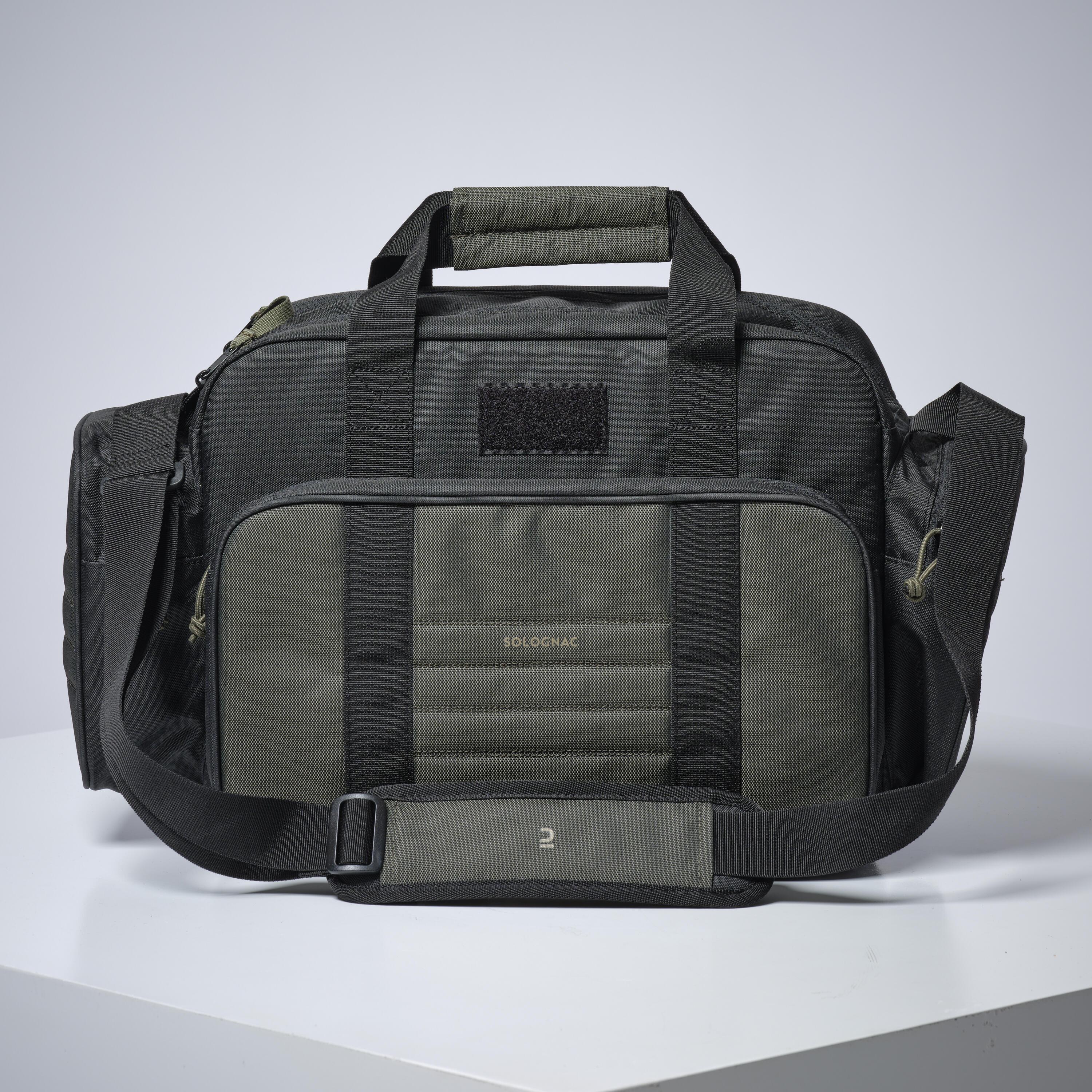 Ein Hauptfach mit 16 l zum Aufbewahren von Munition, Schirmmütze, Werkzeug. Drei Fächer vorne und an den Seiten. Verstellbarer Schultergurt. Herausnehmbarer Boden.