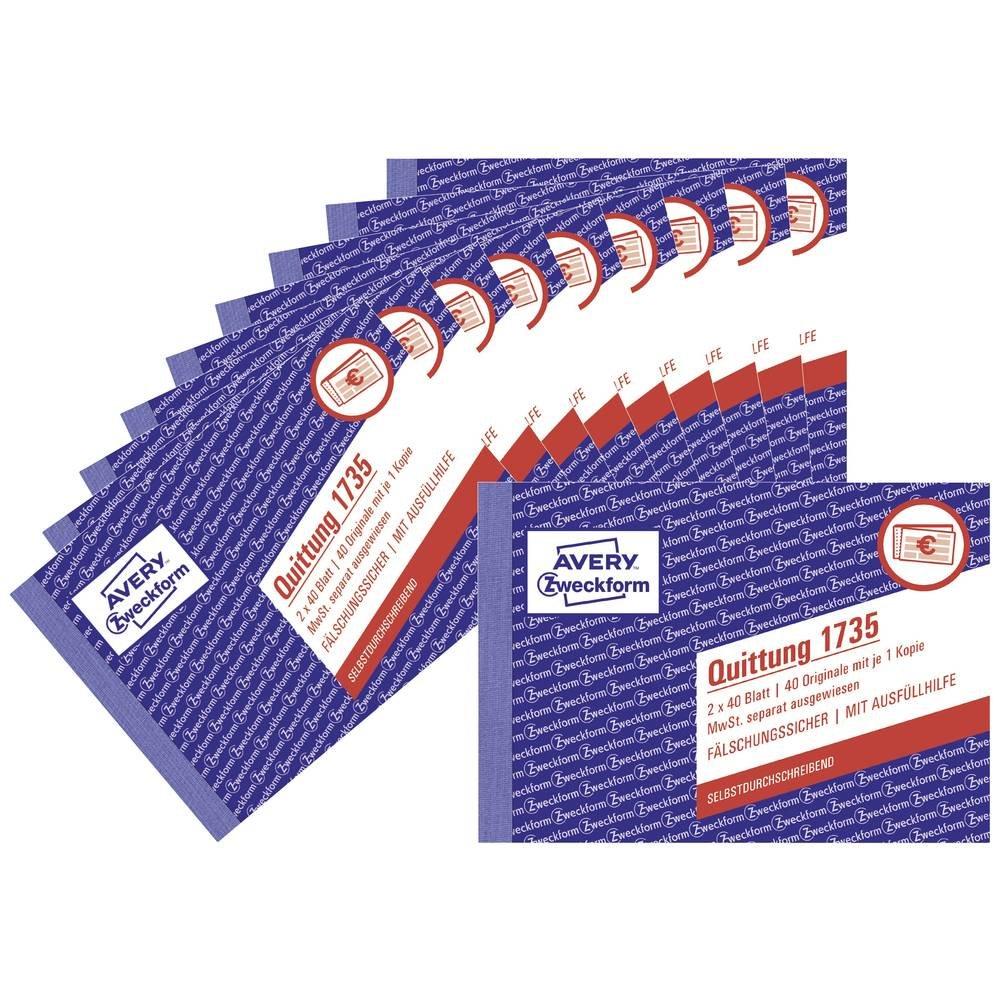 Die Quittung im 10er Pack 1735-10 von AVERY ZWECKFORM im DIN A6 Querformat ist mit einem feinen, netzartigen Sicherheitsdruck ausgestattet. Somit ist die Quittung garantiert fälschungssicher. Jedes Quittungsbuch beinhaltet 40 vorgedruckte, weisse Quittungsvorlagen und jeweils 1 vorgedruckten, selbstdurchschreibenden Durchschlag in Gelb. Auf jeder Quittungsvorlage wird die MwSt. separat ausgewiesen. Die Quittungen und Vordrucke von Avery Zweckform sind zuverlässige, bewährte Hilfen für Ihre Warenwirtschaft, Buchhaltung und Steuer. Die Formulare werden regelmässig von Rechtsexperten geprüft.