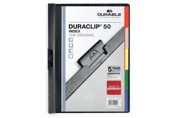 DURACLIP - Klemmheft Index A4 DURACLIP® ? das Original: von DURABLE entwickelt, aus strapazierfähiger Folie, mit langlebiger Klemme aus Spezialstahl. Zum Präsentieren, Ordnen und Aufbewahren von Angeboten, Besprechungs- und Schulungsunterlagen, Berichten, Dokumenten. Mit 5 Jahren Clip Garantie! Mit integriertem, 5-teiligem, farbigen Register. Für ungelochtes Schriftgut Klemmhefter Rücken schwarze Hartfolie