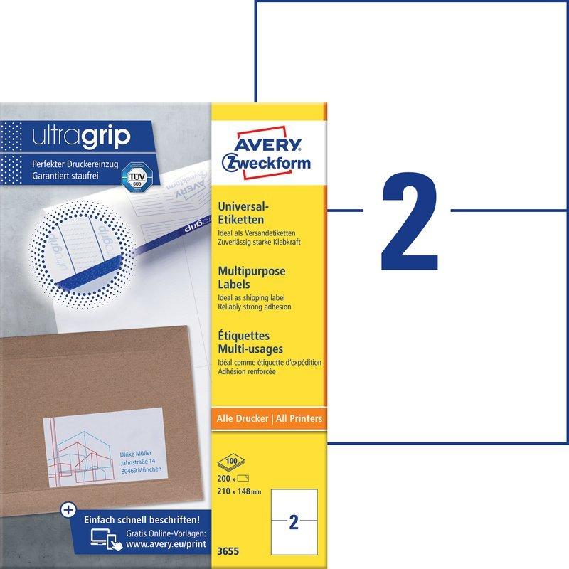 Die weissen, permanent haftenden Universal-Etiketten 3655 im Format 210 x 148 mm von AVERY ZWECKFORM eignen sich z.B. als Inhaltsetiketten oder für DHL Online Frankierung und Schweizer Post (200 Etiketten/Pack). Dank der innovativen ultragrip-Technologie können Sie sich auf einen ultrapräzisen Druckereinzug und absolut staufreien Druckerdurchlauf verlassen. Die QCT-Sicherheitskante verhindert Klebstoffablagerungen im Drucker. Druckerdurchlauf für Laser-Drucker getestet und bestätigt durch TÜV SÜD. Die Aufkleber kleben zuverlässig auf Papier, Karton, Glas und Kunststoffen und überzeugen mit einem klaren Druckbild ohne Verwischen.Gestalten und drucken Sie Ihre Aufkleber schnell und einfach mit den Avery Zweckform gratis Vorlagen im Design&Print Online Designer oder den im Microsoft® Office Paket integrierten Basis-Vorlagen. Geeignet für alle gängigen Laser- und Inkjet-Drucker.Das klimaneutrale Unternehmen Avery Zweckform verwendet schon seit 2014 ausschliesslich Ökostrom/-gas. Forschung, Entwicklung, Produktion, Logistik und Verwaltung am Firmenstandort in Oberlaindern/Bayern garantieren höchste Qualitätsstandards, hohe Umweltvorgaben und kurze Lieferwege. Das Obermaterial dieser chlorfrei gebleichten Etiketten wird zu 100% aus FSC®-zertifiziertem Papier aus nachhaltig bewirtschafteten Wäldern hergestellt.