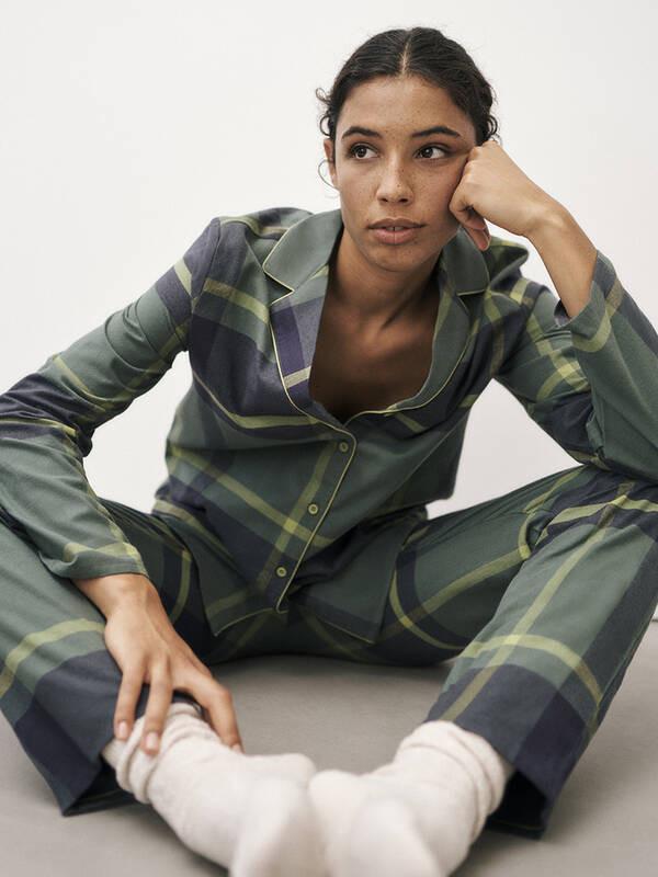Dieses Boyfriend Pyjama-Set bietet eine entspannte Passform für höchsten Komfort. Das Set kombiniert zeitlosen Stil mit gemütlichem Tragegefühl. Das Oberteil hat eine durchgeknöpfte Vorderseite und einen Reverskragen, während die Hose für Bewegungsfreiheit konzipiert ist.