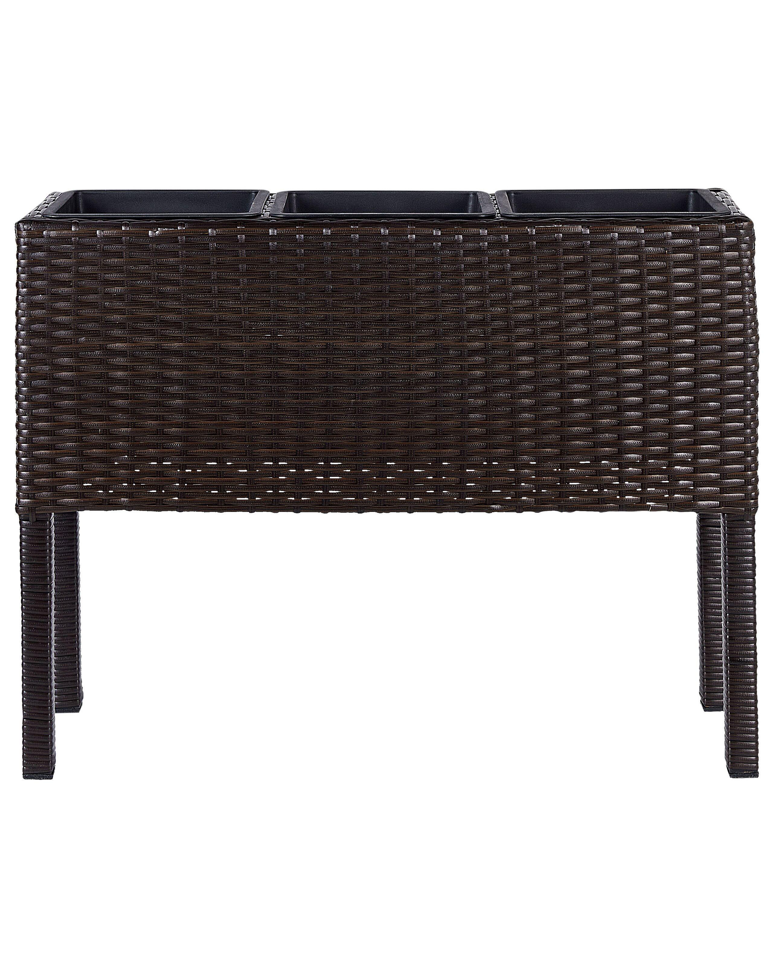 Dunkelbraunes Garten-Hochbeet auf robusten Stelzen mit 3 passenden Einsätzen. Dieser hohe Pflanzkasten besteht aus hochwertigem Rattan und ist mit 3 herausnehmbaren Einsätzen versehen, die sich für allerlei Bepflanzungen eignen. Egal ob Sie diesen Blumenkasten in Wohnräumen oder im Aussenbereich einsetzen, sein robustes Material wird sich garantiert beweisen und lange seine Schönheit bewahren. Dank der Einsätze aus Kunststoff können Sie Ihre Pflanzen einfach sauber und attraktiv halten, während das Rattangeflecht dabei entsprechend vor Wurzelwachstum geschützt wird. Durch das robuste Stahlgestell ist seine Standsicherheit gewährleistet.