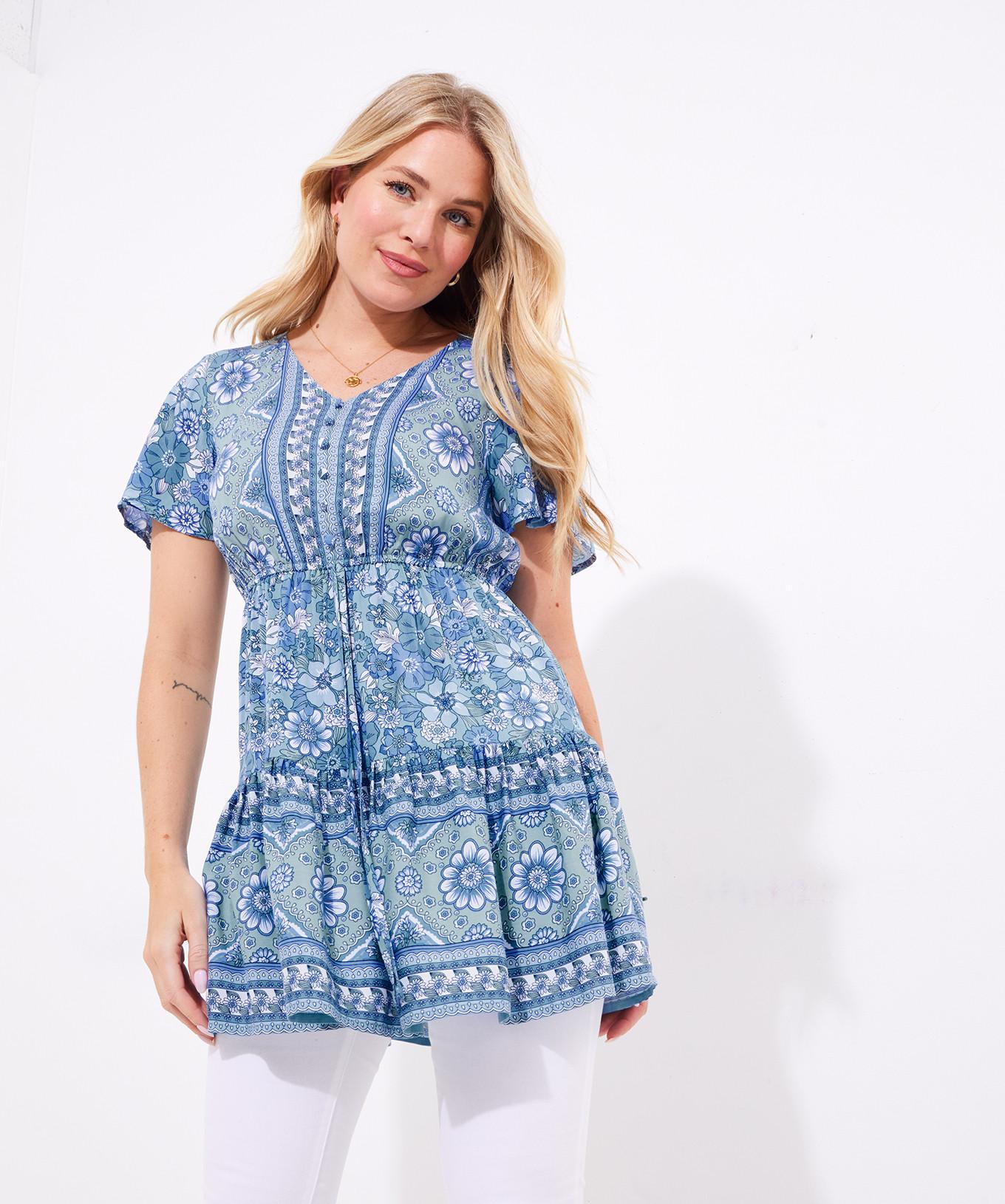 Diese geblümte Tunika mit V-Ausschnitt verleiht dem Sommer-Styling einen Boho-Touch und hebt sich von allen anderen ab. Das Design kombiniert aufwendige Muster mit einer lockeren Passform und ist somit eine vielseitige Ergänzung für jede Garderobe.