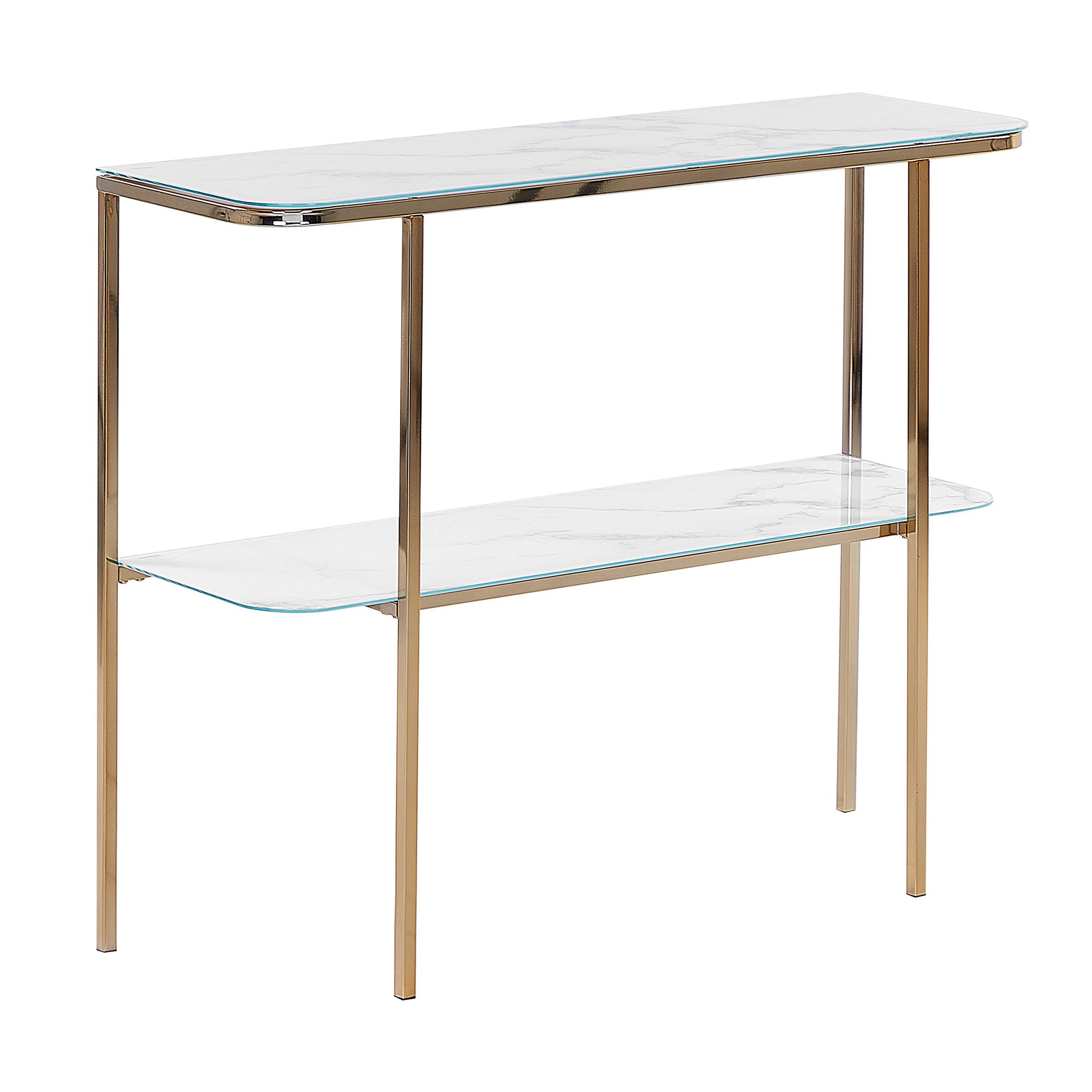Glamouröser Schminktisch mit Marmor-Effekt und zusätzlicher Ablage. Bringen Sie mit diesem glamourösen Konsolentisch Eleganz und Funktionalität in Ihren Wohnraum. Die zwei Glasablagen in Marmor-Optik werden Ihr Wohnzimmer, Ihren Flur oder Ihr Schlafzimmer bereichern. Das Möbelstück bietet auch genügend Platz, um dekorative Vasen auszustellen oder die Dinge zu organisieren, die Sie griffbereit haben möchten. Die stabilen, goldenen Metallbeine mit glänzendem Finish ergänzen das elegante Gesamtbild des Möbelstücks.