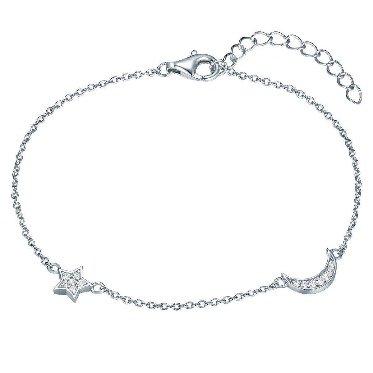 Von der Antike bis heute faszinieren uns die Himmelskörper am Firmament und inspirieren auch das Schmuckdesign. Wenn Sie an die Kraft des Mondes glauben, ist dieses Motiv-Armband des Labels Rafaela Donata ein Highlight in Ihrem Schmuckkästchen! An einem Ankerkettchen schmiegt sich der stilisierte Mond-Anhänger an Ihr Handgelenk und erinnert täglich daran, dass alles im Wandel ist. Niedlicher Eyecatcher ist ein asymmetrisch versetzter, in die Ankerkette integrierter Stern. Gefertigt aus rhodiniertem, anlaufgeschütztem 925er Silber und mit glitzernden Zirkoniakristallen besetzt, entsteht ein glamouröses Accessoire. Praktisch: Dank des Verlängerungsstücks lässt sich das Armband unkompliziert an Ihr Handgelenk anpassen.