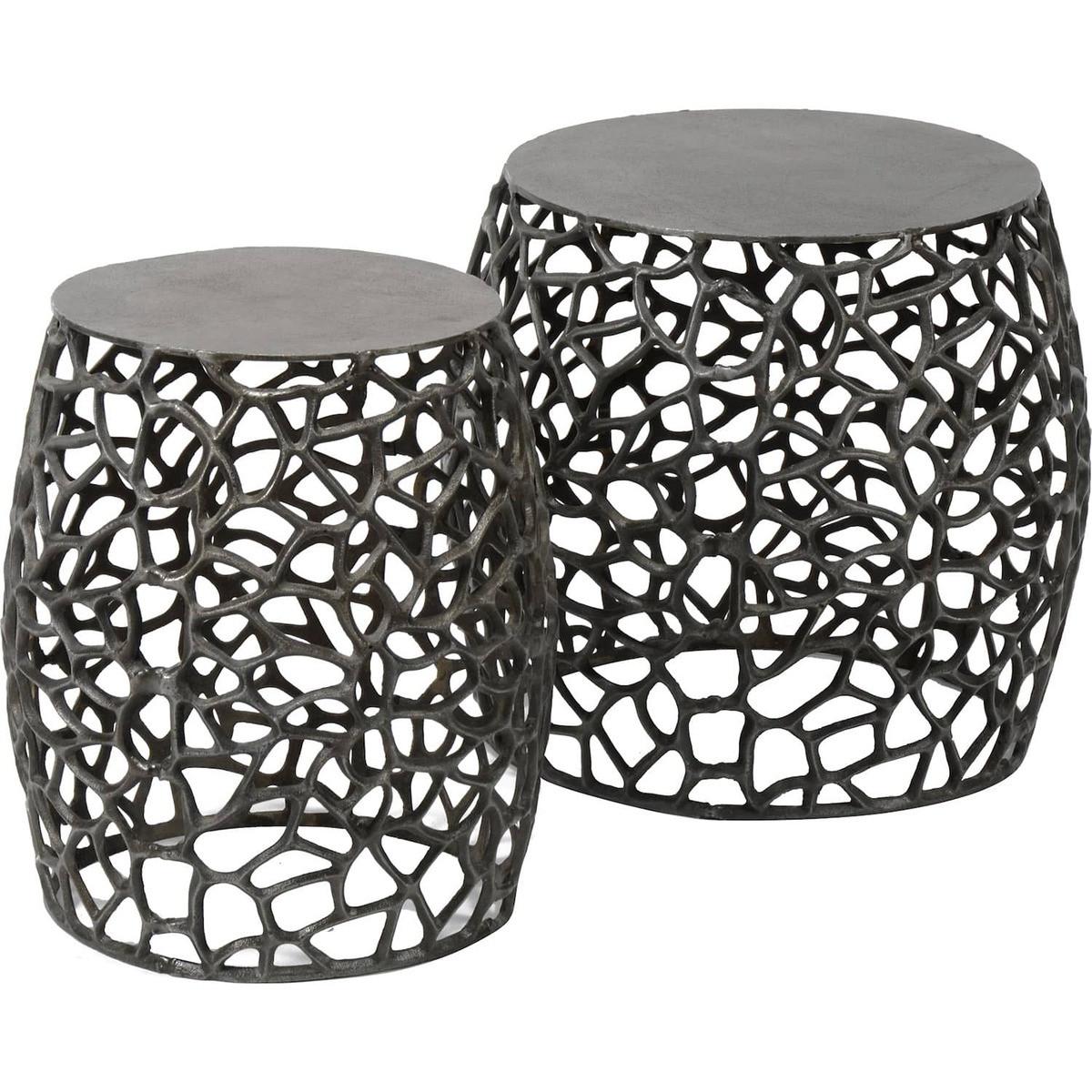 Dieser Beistelltisch besteht aus einem Set von zwei. Beide Tische sind mit einer dünnwandigen Tischplatte aus schwarzem Nickel versehen. Der dekorative Sockel besteht aus Aluminium und verleiht den Beistelltischen eine verspielte Optik.Abmessungen L: 35 cm, B: 35 cm, H: 42 cm / L: 45 cm, B: 45 cm, H: 42 cm