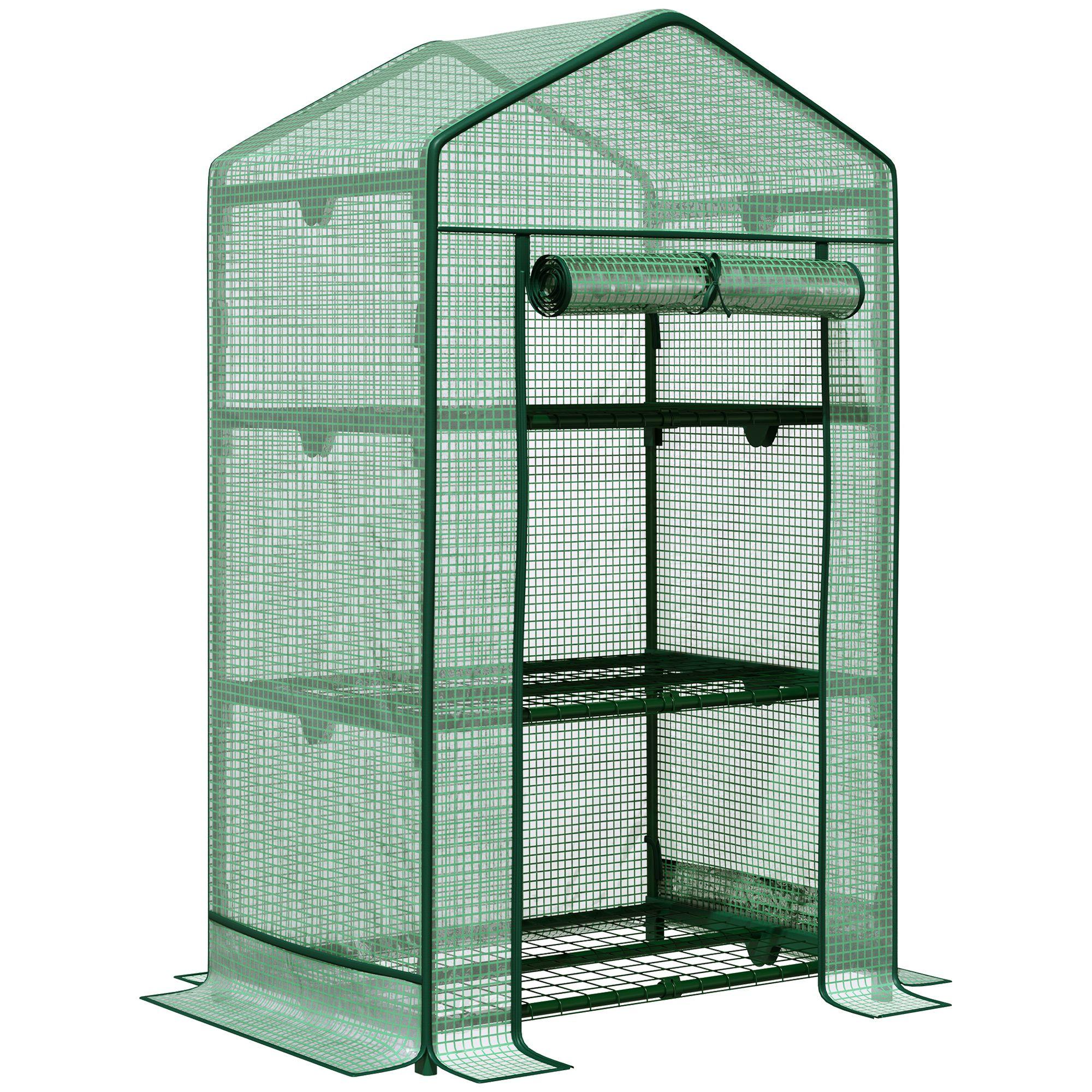 Mit diesem kompakten Mini-Gewächshaus mit mehrstöckigen Regalen von Outsunny können Sie Ihre grünen Daumen überall einsetzen. Der Rahmen besteht aus robustem Metall, damit das Balkongewächshaus den ganzen Tag über aufrecht und stabil steht, und eine langlebige Kunststoffabdeckung schützt Ihre Pflanzen im Inneren vor Kälte. Dieses Anzuchtgewächshaus ist eine gute Wahl, wenn Sie mit dem Anbau Ihrer eigenen Produkte beginnen möchten.