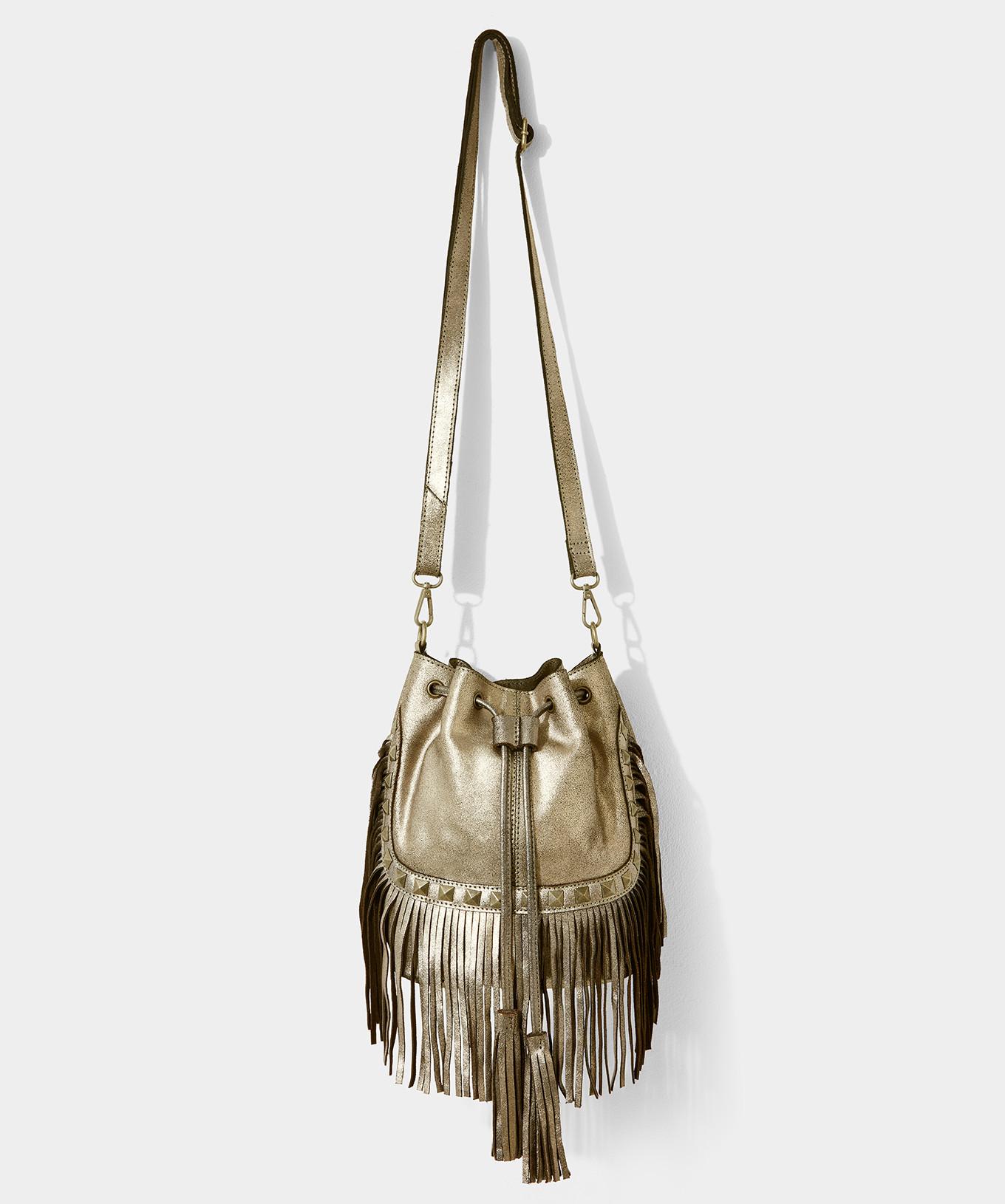 Diese goldene Wildleder-Fransentasche ist ein stilvolles und vielseitiges Accessoire für verschiedene Anlässe. Ihr Design kombiniert klassische Elemente mit einem modernen Touch und macht sie zu einem herausragenden Stück.