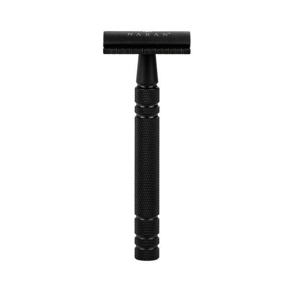 Dreiteilig. Matt. Schwarz. Aus beschichtetem Messing. Geeignet für handelsübliche Rasierklingen.