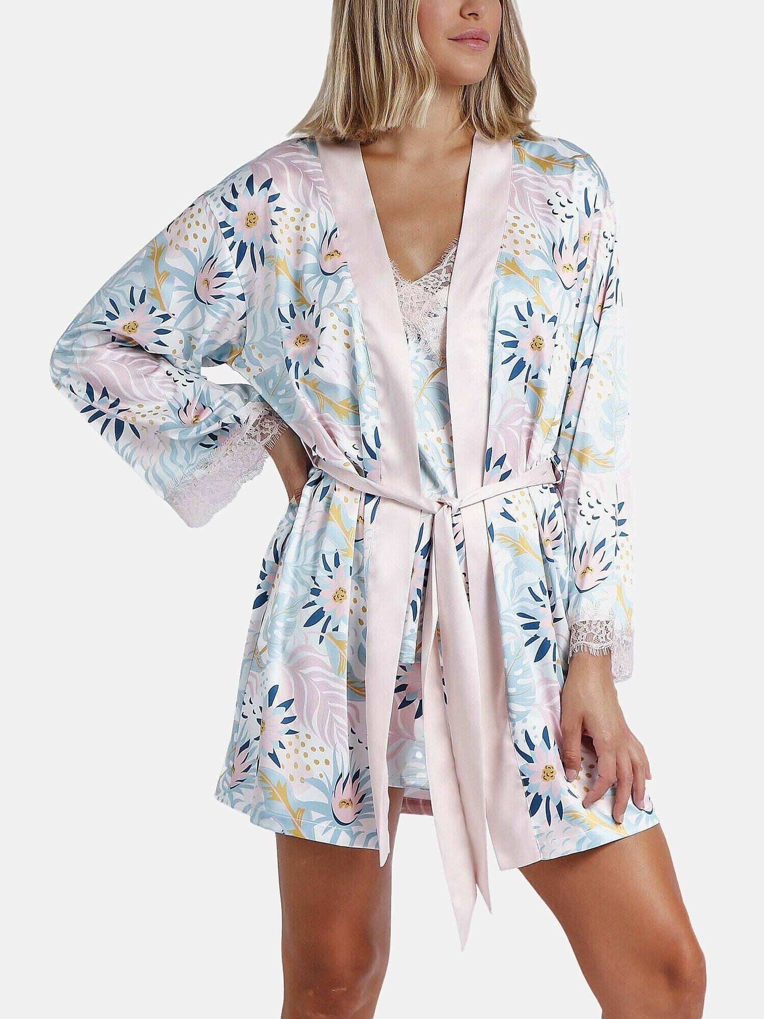 Das Water Lili Negligé bietet einen frischen und femininen Look mit einem Blumendruck in Pastelltönen. Es besteht vollständig aus ultrabequemem Satinstoff, der leicht und zart auf der Haut liegt. Die langen Ärmel sind mit einer hübschen, feinen und femininen Spitze gesäumt. Es kann offen oder geschlossen getragen werden, dank eines Gürtels, der in der Taille gebunden wird. Der Stoff ist angenehm auf der Haut und fühlt sich weich an.