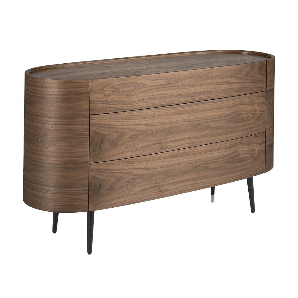 Kommode in modernem Design mit einer Holzstruktur, die mit natürlichem Nussbaum furniert ist, und originellen Beinen aus schwarzem Edelstahl. Es hat einen großen Stauraum mit 3 Schubladen mit Soft-Closing-System.