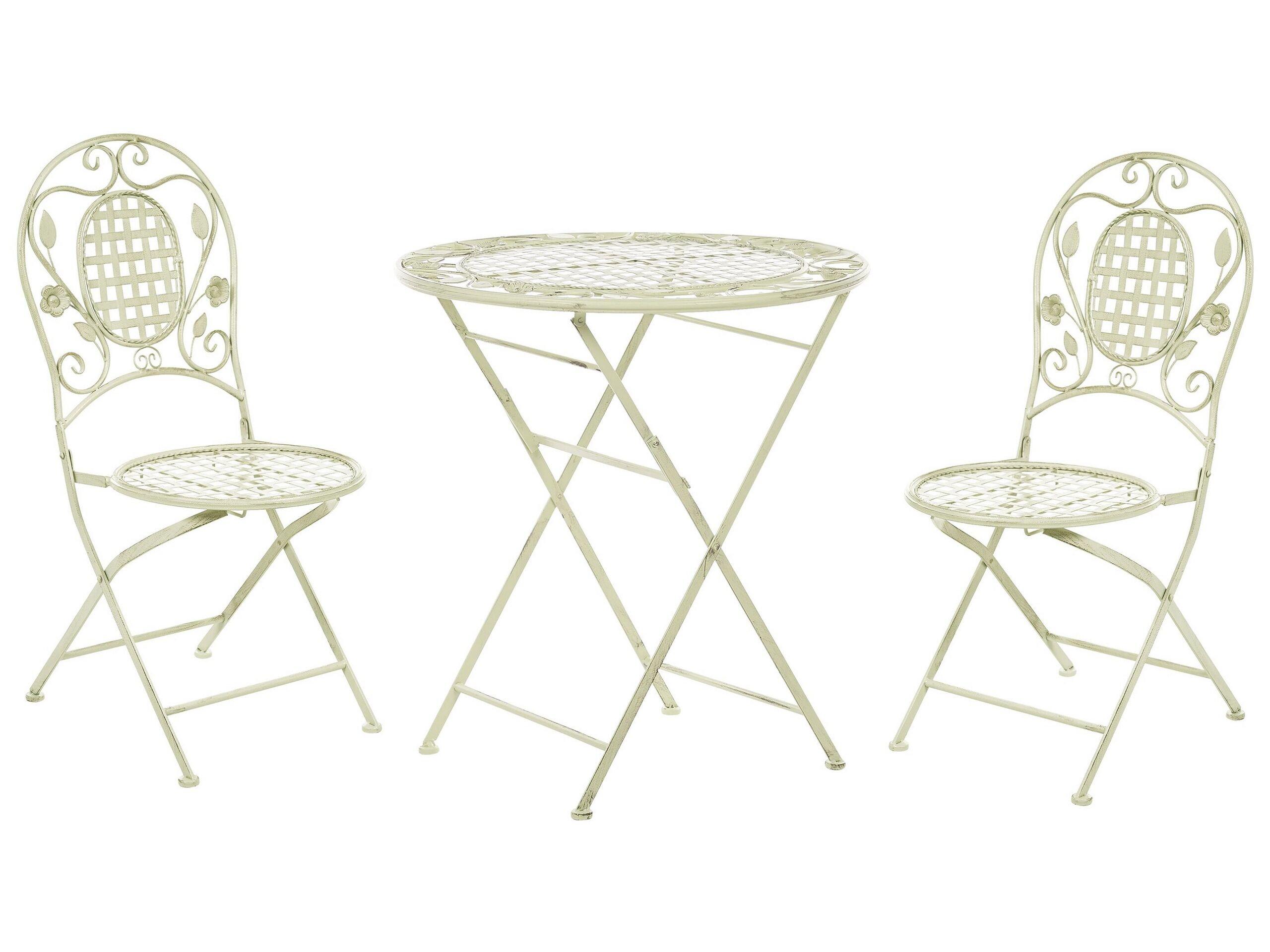Klappbares Bistro-Set für 2 Personen. Bringen Sie einen kleinen Hauch von provenzalischem Stil auf Ihren Balkon oder in Ihren Garten und genießen Sie dieses elegante Bistro-Set. Es ist aus pulverbeschichtetem Eisen gefertigt, hat einen Antik-Effekt und ein durchbrochenes Design mit floralen Elementen. Das Balkonset besteht aus zwei Stühlen und einem passenden Tisch, perfekt für ein Frühstück oder ein Mittagessen für zwei Personen, in jedem Außenbereich. Jedes Stück ist faltbar, so dass Sie es in der Zwischensaison leicht verstauen können.