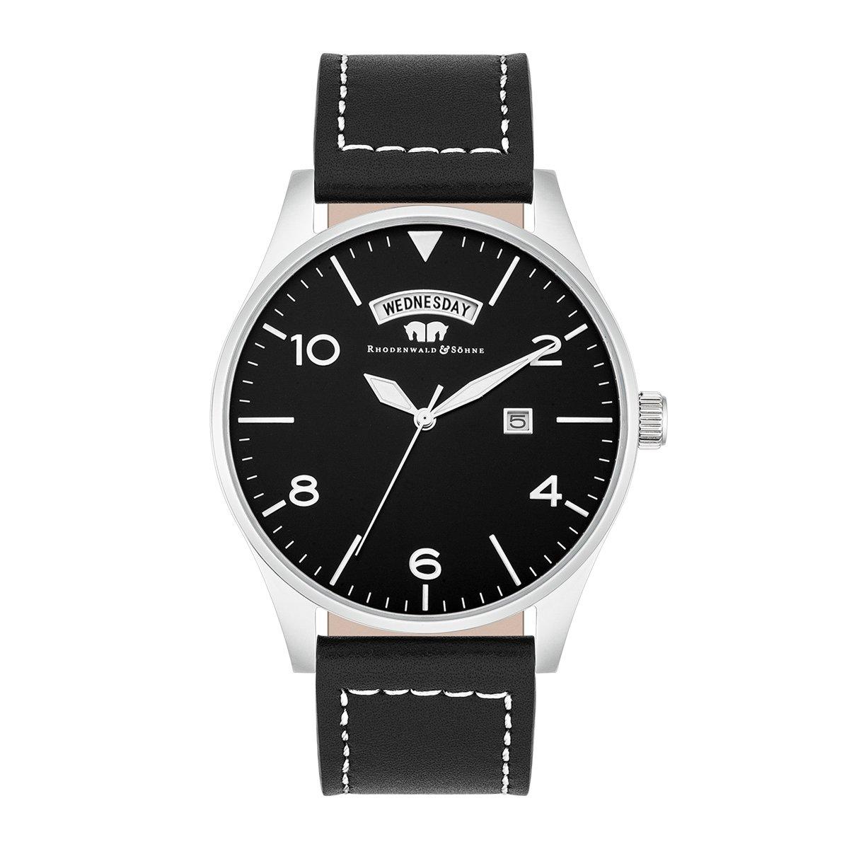 Weniger ist mehr: Nach diesem Motto wurde das Design dieser exklusiven Herrenuhr der Manufaktur Rhodenwald & Söhne entworfen. Reduziert auf Datums- und Wochentagsanzeige und schlichte Strichindices kombiniert mit arabischen Ziffern und Feuille-Zeigern überzeugt das Zifferblatt mit Minimalismus. Hinter der Optik in der Tradition alter Uhrmacherkunst überzeugen moderne Materialien und zeitgemäße Technik: Das Gehäuse besteht aus robustem Edelstahl und ein präzises Quarzuhrwerk und robustem Mineralglas runden die hochwertige Ausstattung ab. Ein Echtlederarmband mit prägnanter Kontrastnaht und komfortabler Dornschließe sorgt für besten Tragekomfort.