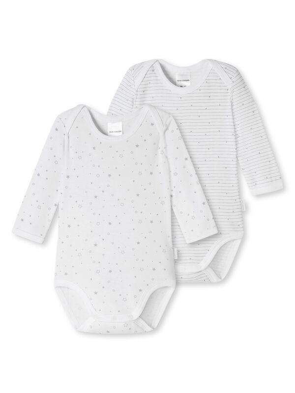 weisse, niedlich bedruckte Langarm-Bodies praktische Druckknöpfe im Windelbereich für ein unkompliziertes Umziehen in babyweicher, hochwertiger Feinripp-Qualität aus 100% Organic-Cotton