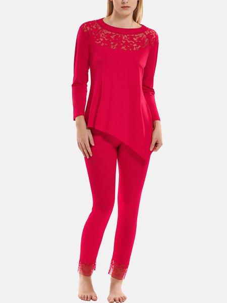 Dieses Pyjama-Set aus der Flamenco-Kollektion besteht aus einem Oberteil mit langen Raglanärmeln und einer passenden Hose. Das Oberteil hat eine elegante asymmetrische Form und ist am Ausschnitt mit dekorativer Spitze verziert, die von einem Mesh-Saum abgeschlossen wird. Die Spitze wiederholt sich als Detail über die Länge des Pyjamaunterteils.