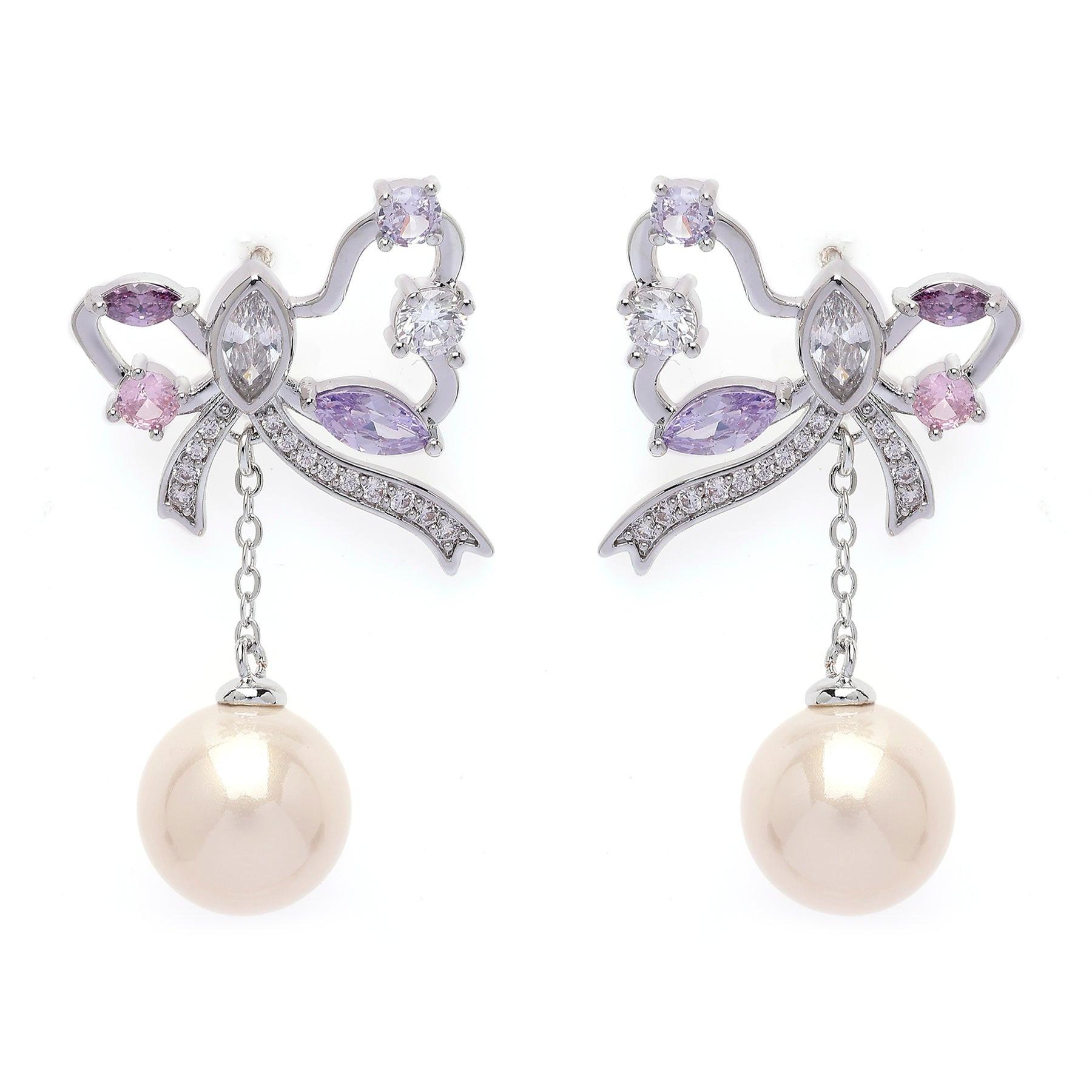 Stellen Sie sich ein Geschenk einer Fee vor: Kristallbesetzte Schleifen, verziert mit Amethyst und Rosenquarz, umschließen sanft leuchtende, traumhafte Perlen. Diese Ohrringe sind nicht einfach nur Schmuckstücke, sondern kleine Kunstwerke, die einen zauberhaften Moment einfangen und Ihrem Stil einen Hauch von Märchenmagie verleihen. Größe: 2,2 cm x 3,7 cm | Beschichtung: Rhodiumplattiert | Verschluss: Stecker und Rückseite