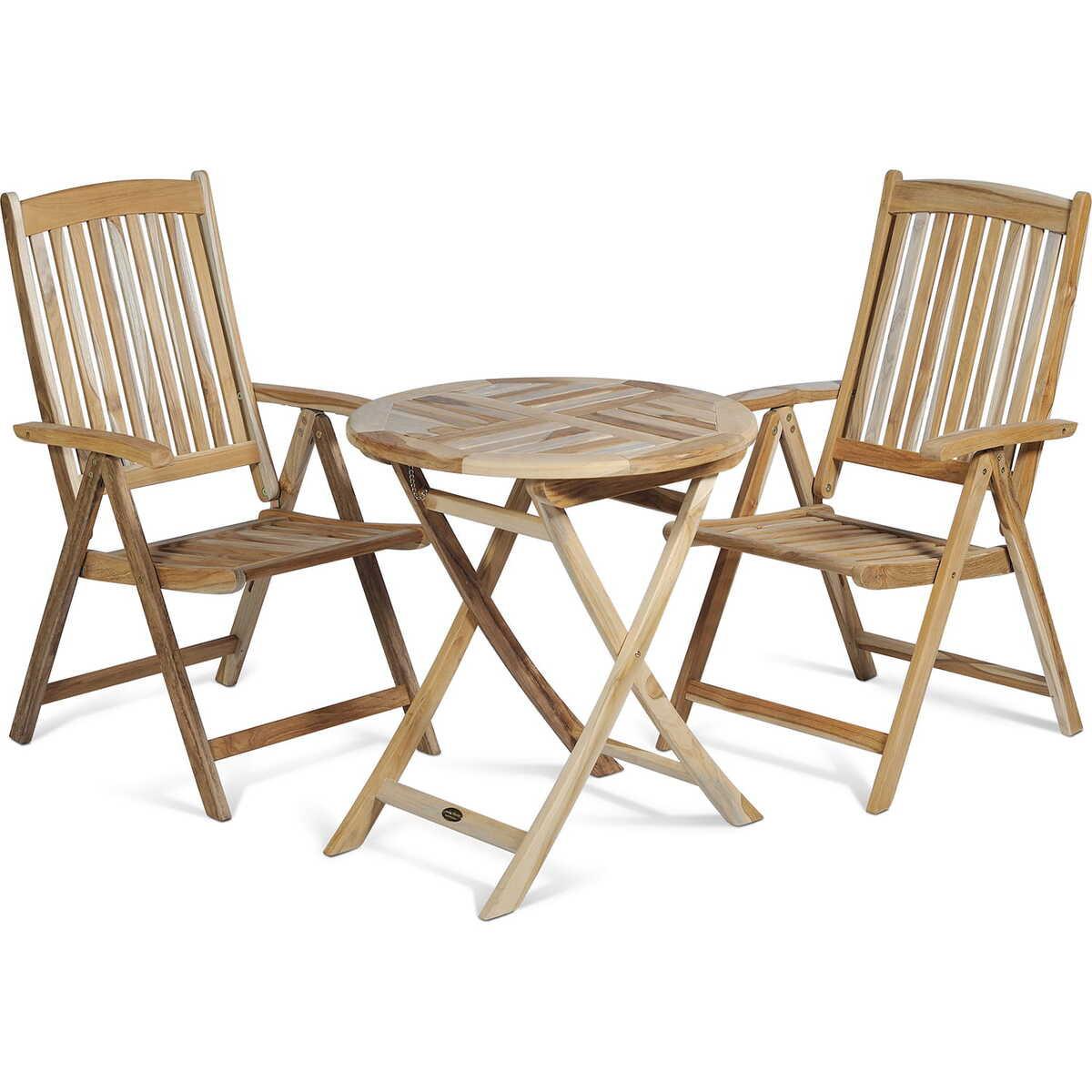Die Tischgruppe Java, eine Kombination aus hochwertigem Teakholz und elegantem Design, bietet die perfekte Balance zwischen Komfort und Stil. Ob für entspannte Mahlzeiten im Freien, gesellige Treffen oder einfach zum Entspannen - dieses Set wird jeden Outdoor-Bereich aufwerten. Die natürliche Schönheit und Langlebigkeit des Teakholzes, kombiniert mit dem einzigartigen Design der Möbel, macht dieses Set zu einem echten Hingucker in jedem Garten oder auf jeder Terrasse. Geniessen Sie die Flexibilität einer 5-fach verstellbaren Rückenlehne und den Komfort eines robusten Tisches mit den Massen 70x70 cm, der ausreichend Platz für Mahlzeiten und Getränke bietet.