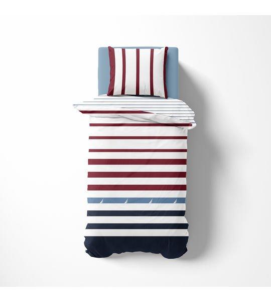 Das Finn Bettwäsche-Set verleiht jedem Schlafzimmer eine frische, maritime Note. Mit einem lebhaften Streifenmuster in Rot, Blau und Weiss umfasst dieses Set einen Bettbezug und einen passenden Kissenbezug, verziert mit einem dezenten Segelbootmotiv.