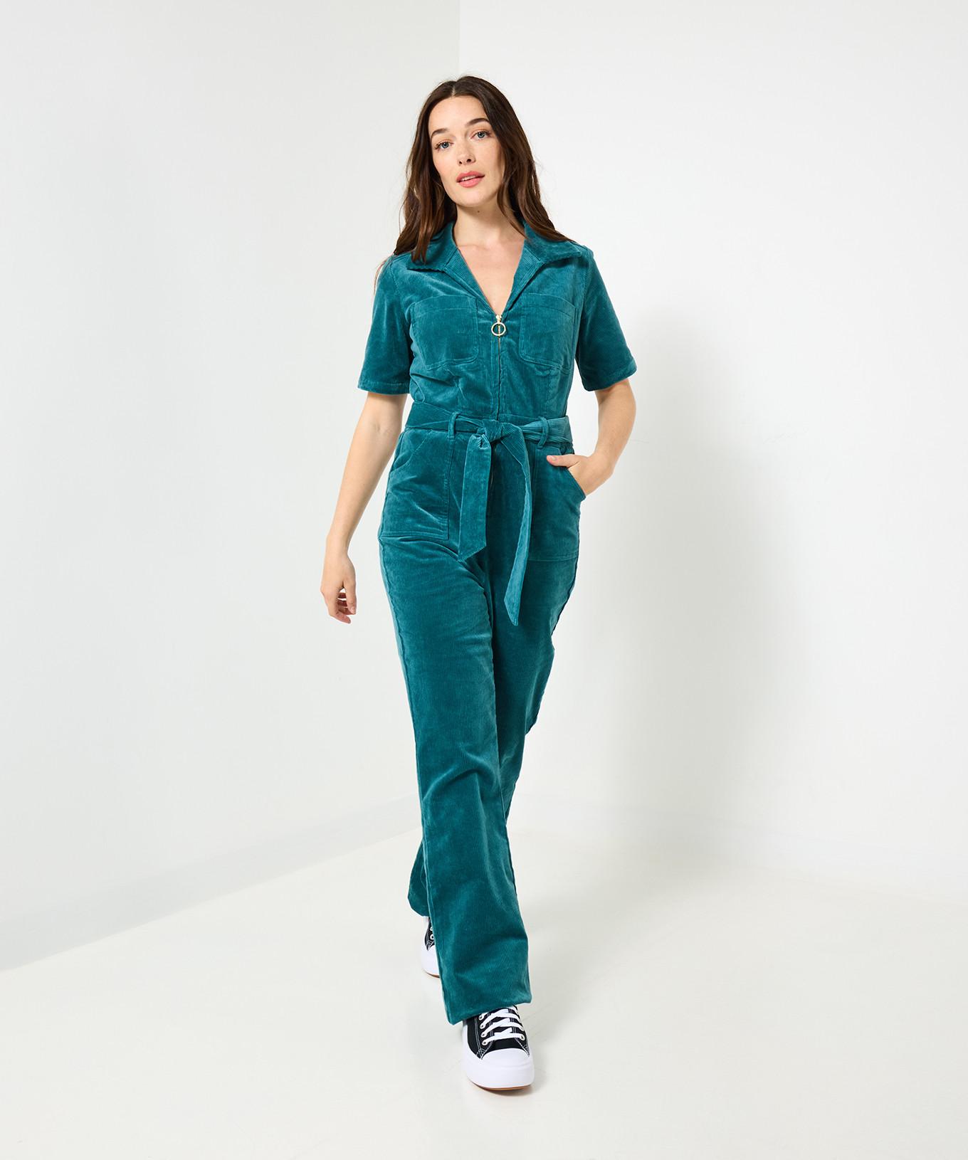 Dieser Cord-Jumpsuit verfügt über ein Bootcut-Bein, einen praktischen Reissverschluss und einen stilvollen Gürtel zur Taillierung. Er bietet ein bequemes und modisches Einteiler-Outfit, das für verschiedene Anlässe geeignet ist.