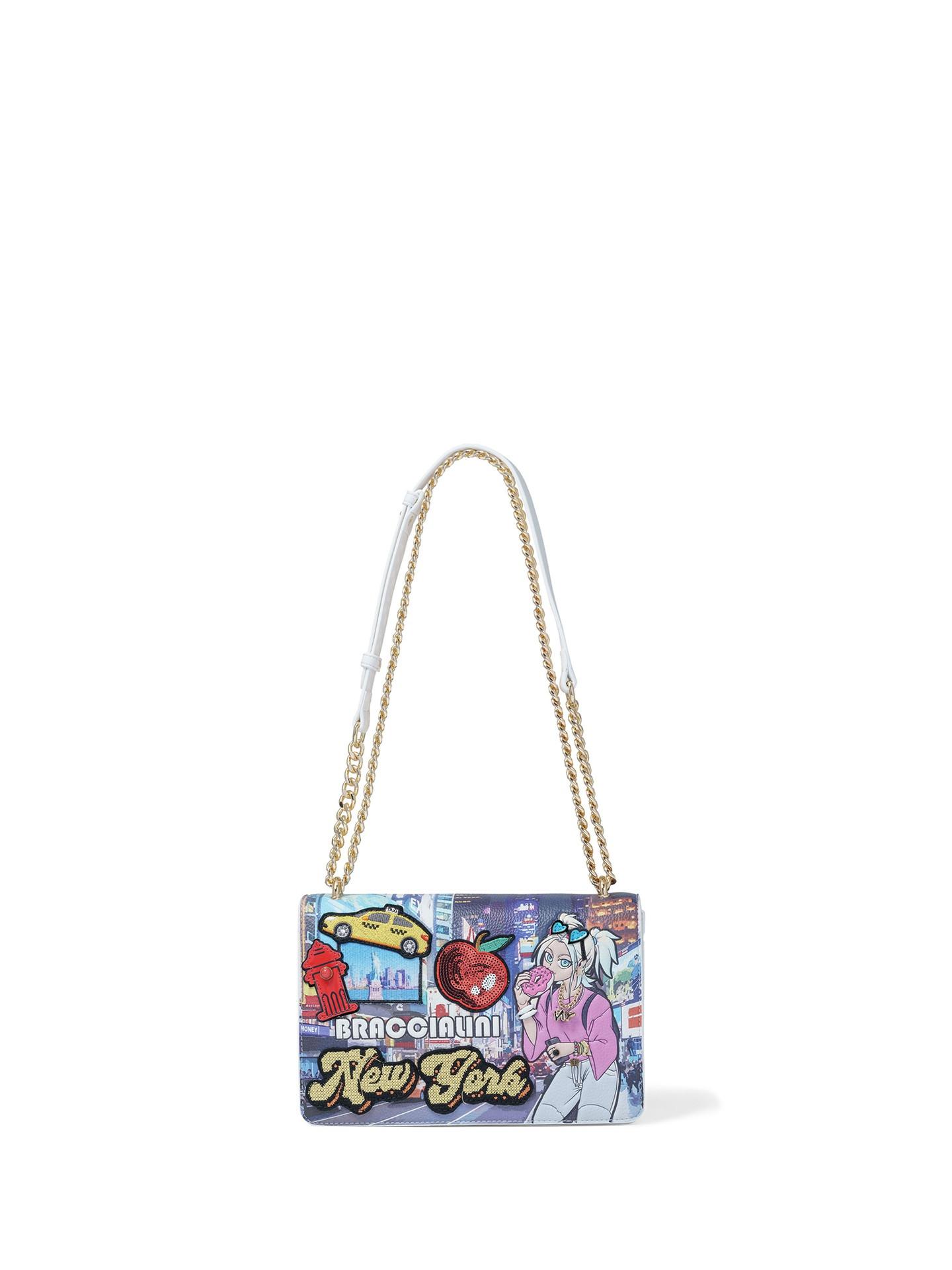 Diese Umhängetasche präsentiert auf der Vorderseite ein lebhaftes Design im New York-Stil, ergänzt durch verspielte Patches und Schriftzüge. Die Rückseite zeigt eine detaillierte Stadtlandschaft und bietet einen vielseitigen Look. Sie ist mit einem stilvollen Kettenriemen ausgestattet, der ein bequemes Schulterpolster enthält.