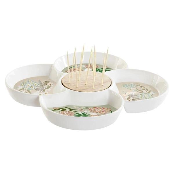 Servieren Sie Aufschnitt, Vorspeisen und Vorspeisen mit diesem praktischen Snackteller. Mit 5 Fächern bietet der Teller viel Platz, egal ob Sie eine Party organisieren oder die Familie zum Essen einladen! Der Mittelteil besteht aus einem Bambustablett mit herausnehmbaren Zahnstochern. Der Teller hat ein attraktives Blumenmuster.