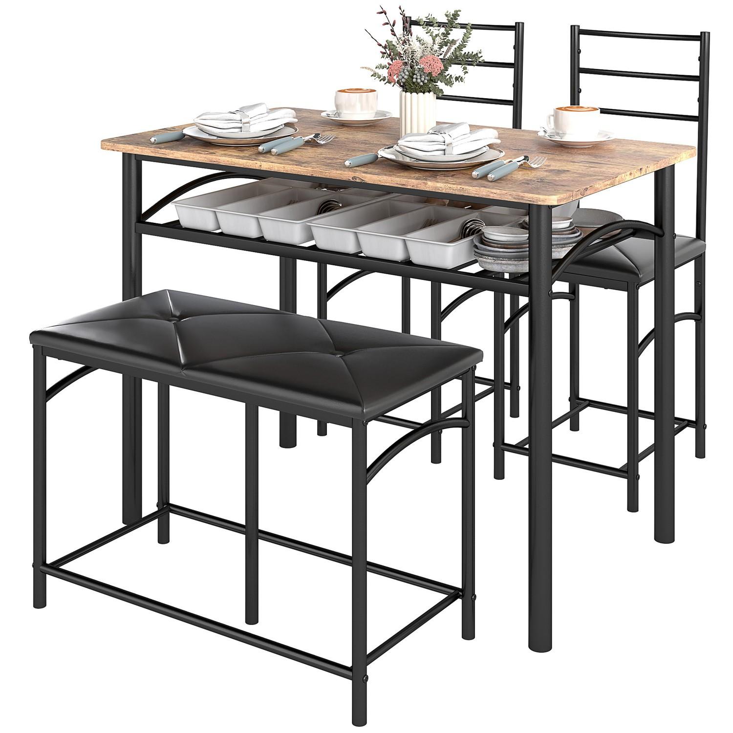 Northio 4-tlg. Essgruppe, Esstisch mit 2 Stühlen, Bank, Platzsparende Esszimmergruppe, Esstisch-Set für kleine Räume, Küche, Esszimmer, Braun Aosom
