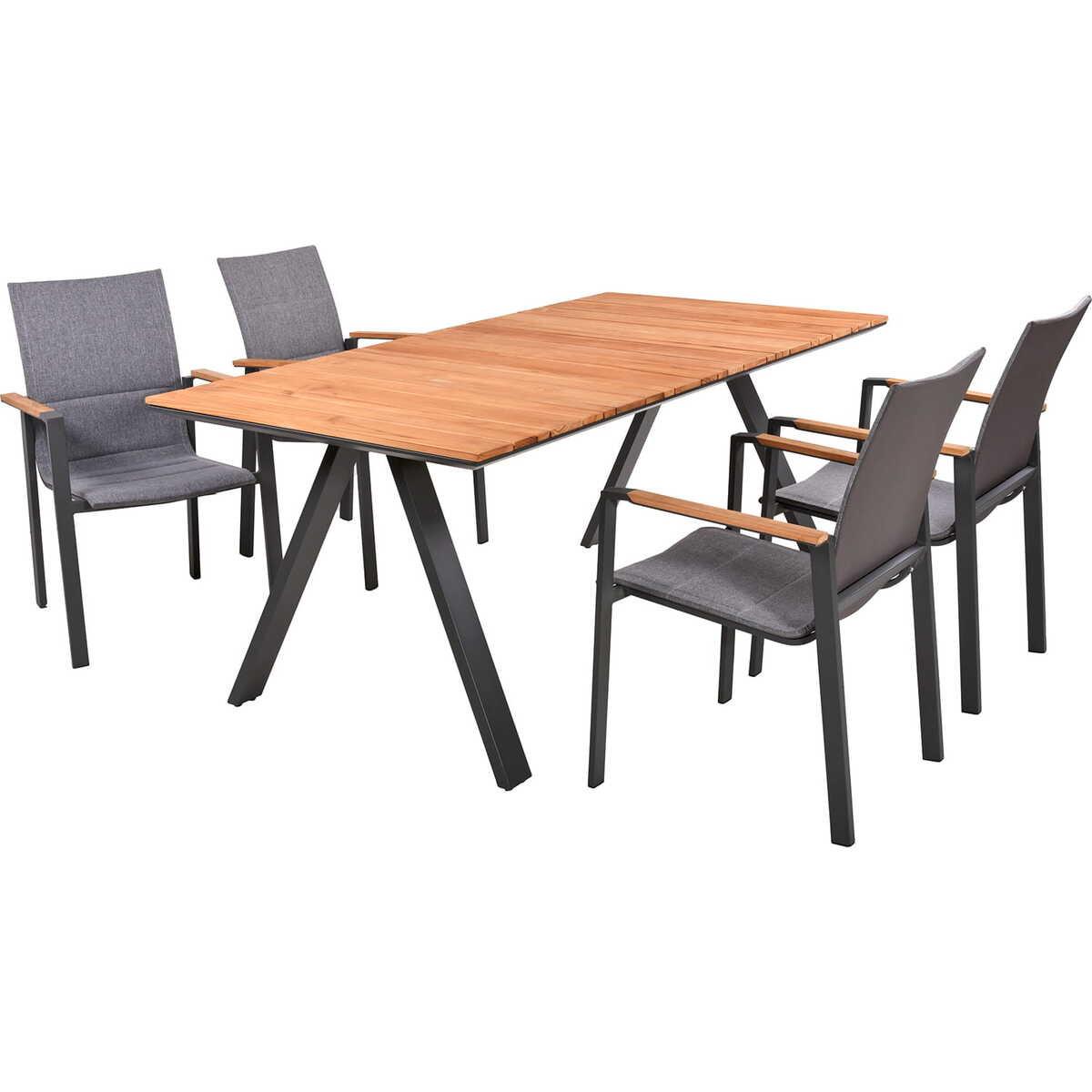 Die Tischgruppe Davina ist eine exquisite Kombination von Ästhetik und Funktionalität, die Ihren Innen- oder Aussenbereich mit Stil und Komfort bereichert. Mit einem Tisch und vier Stapelstühlen, alle mit pulverbeschichtetem Anthrazit-Aluminiumrahmen und Teakholz-Details, verspricht dieses Set Zuverlässigkeit und Widerstandsfähigkeit. Erleben Sie die natürliche Wärme von 100% FSC-zertifiziertem Teakholz gepaart mit der Stärke von Anthrazit-Aluminium, das nicht nur stabil, sondern auch wetterbeständig ist. Ein zeitgemässes Design, das sowohl für gesellige Zusammenkünfte als auch für entspannte Momente ideal ist.