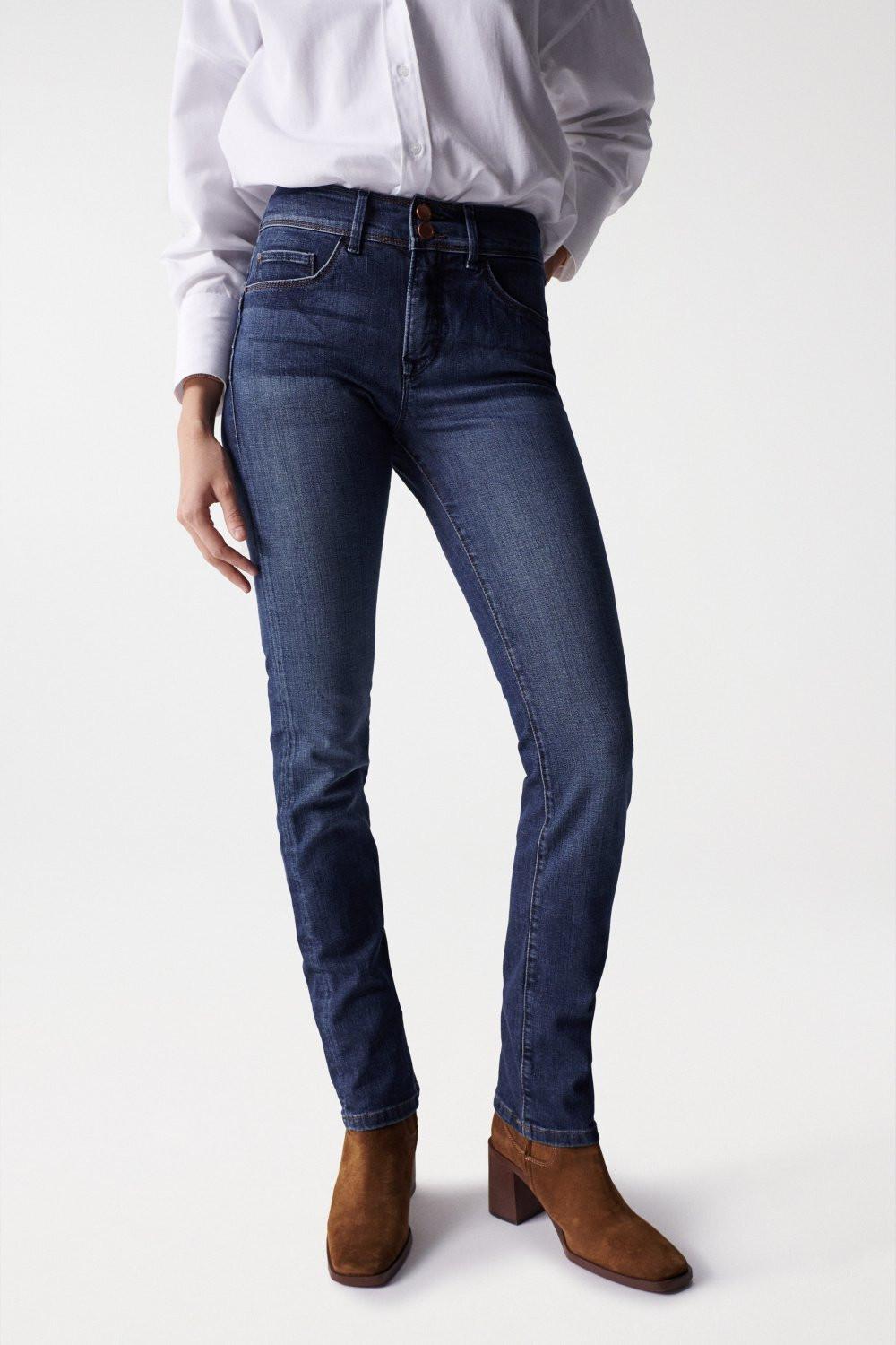 Diese Secret Slim Jeans bieten eine schmeichelhafte Silhouette mit ihrem Slim-Fit-Design. Der leicht verwaschene mittelblaue Denim sorgt für einen positiven Effekt auf den Bauch und maximale Eleganz. Die zweiknöpfige Push In Secret Jeans verfügt über einen Einsatz, der einen schlanken Baucheffekt erzeugt, und die beiden seitlichen Abnäher sorgen für einen leichten Push-up-Effekt.