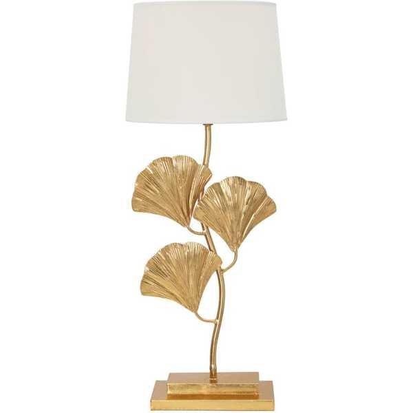Goldene Metall-Tischlampe mit weißem Stoffschirm. Der Sockel aus Blättern erinnert an die Natur und das gesamte Design an eine Pflanze.