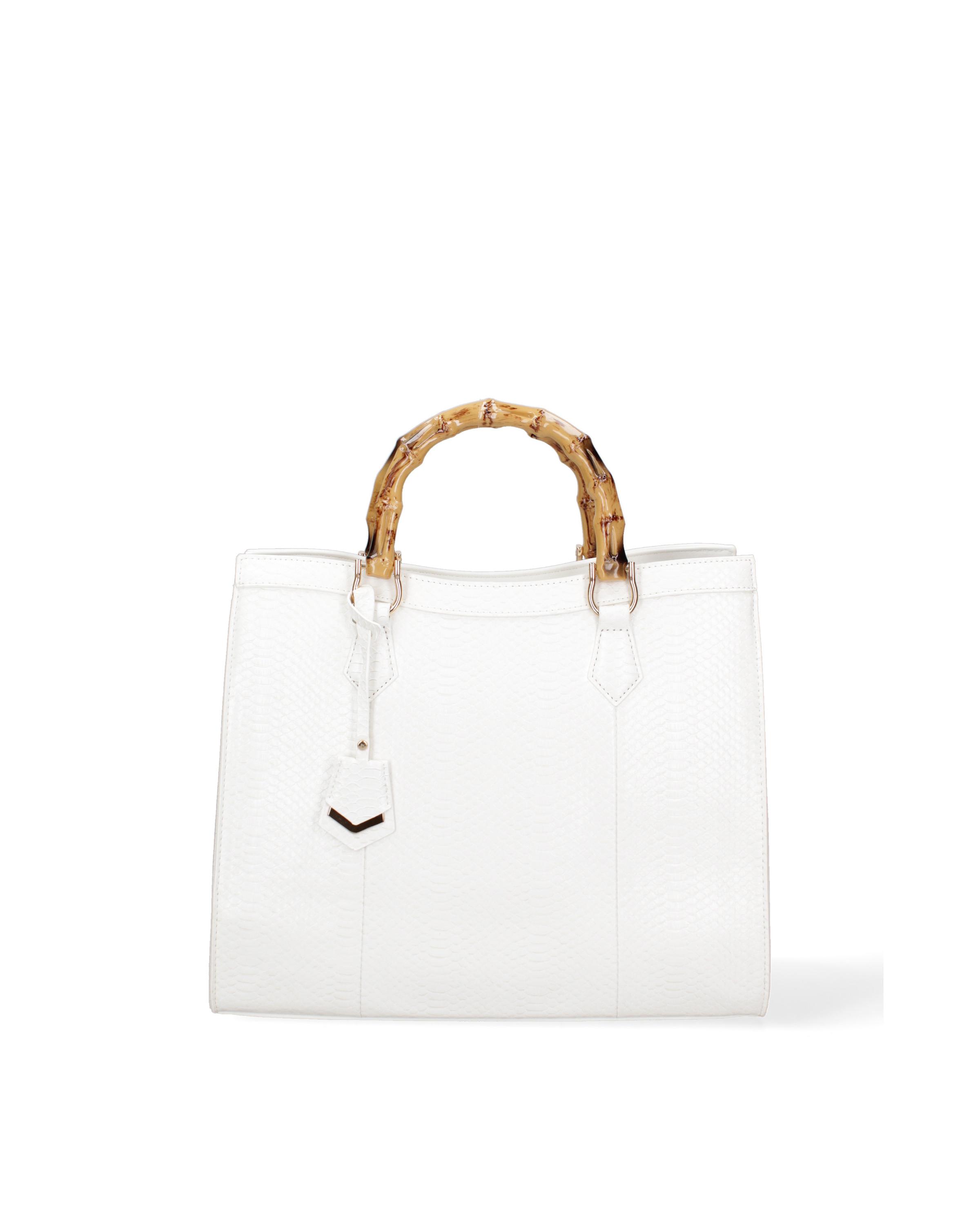 Diese elegante Schultertasche verfügt über einen markanten Bambusgriff, der ihrem Design einen Hauch von natürlicher Raffinesse verleiht. Die klaren Linien und die strukturierte Silhouette der Tasche machen sie zu einem vielseitigen Accessoire für verschiedene Anlässe.