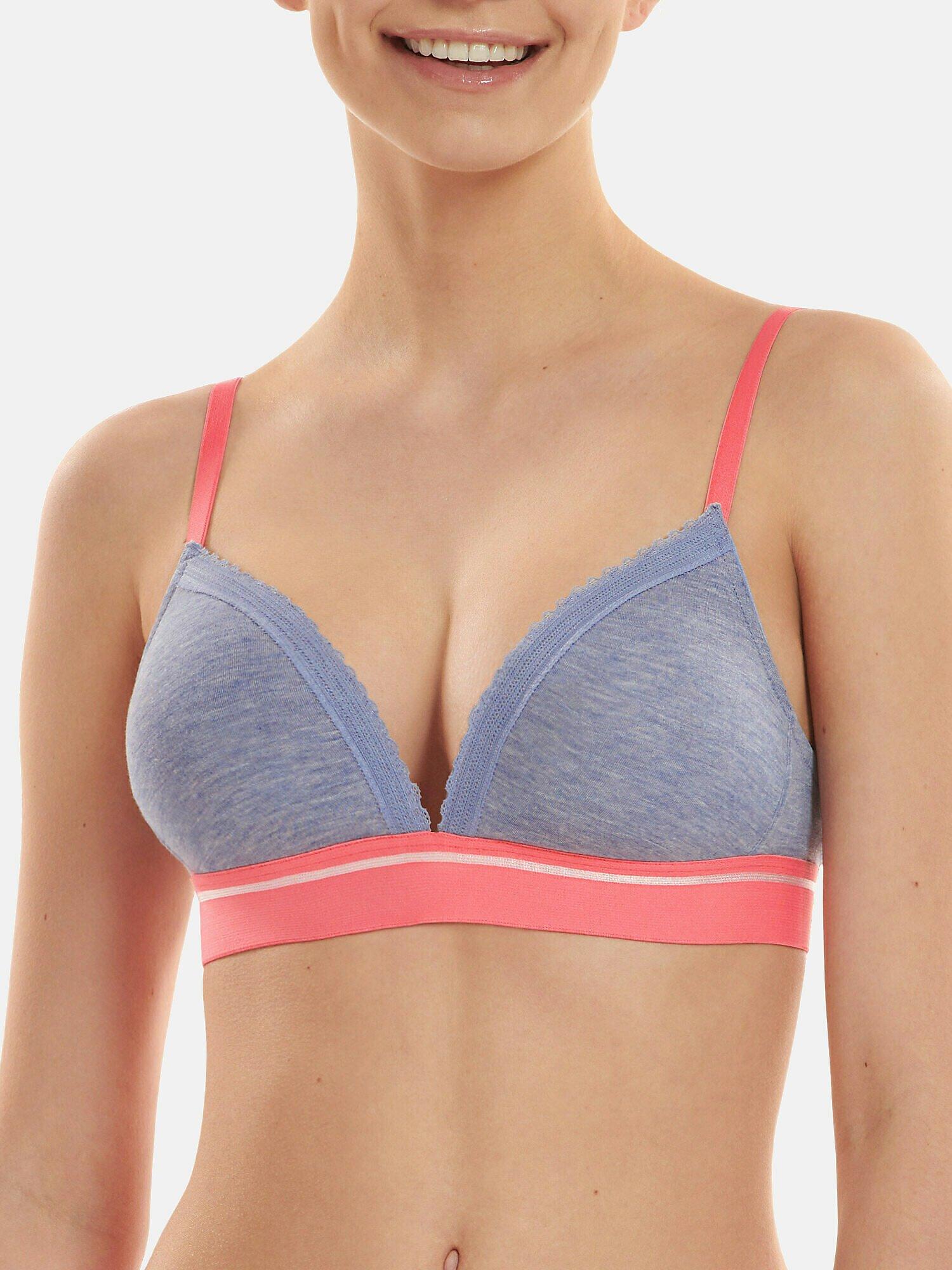 Dieser vorgeformte Triangel-BH aus der Youthful-Kollektion bietet Komfort und Halt ohne Bügel. Er verfügt über leichte, vorgeformte dreieckige Körbchen und ein breites, elastisches Band, das sich über die gesamte Unterbrust erstreckt und für einen sicheren Sitz sorgt. Der Ausschnitt ist mit schmaler, dekorativer Spitze verziert, und die glatten Träger sind farblich abgesetzt. Das Verschlussband und die Träger sind für eine perfekte Passform verstellbar und bei größeren Größen breiter.