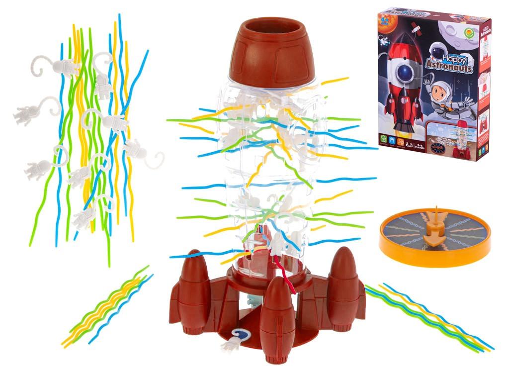 Ein Arcade-Stick-Spiel mit einem neuen Weltraum-Touch. Ziel des Spiels ist es, alle Stöcke zu entfernen, damit möglichst wenige Astronauten von der Rakete fallen. Material: Kunststoff. Abmessungen: Rakete 12,5 cm x 12,5 cm x 28 cm, Astronaut 2 cm x 4 cm, Stab 17 cm.