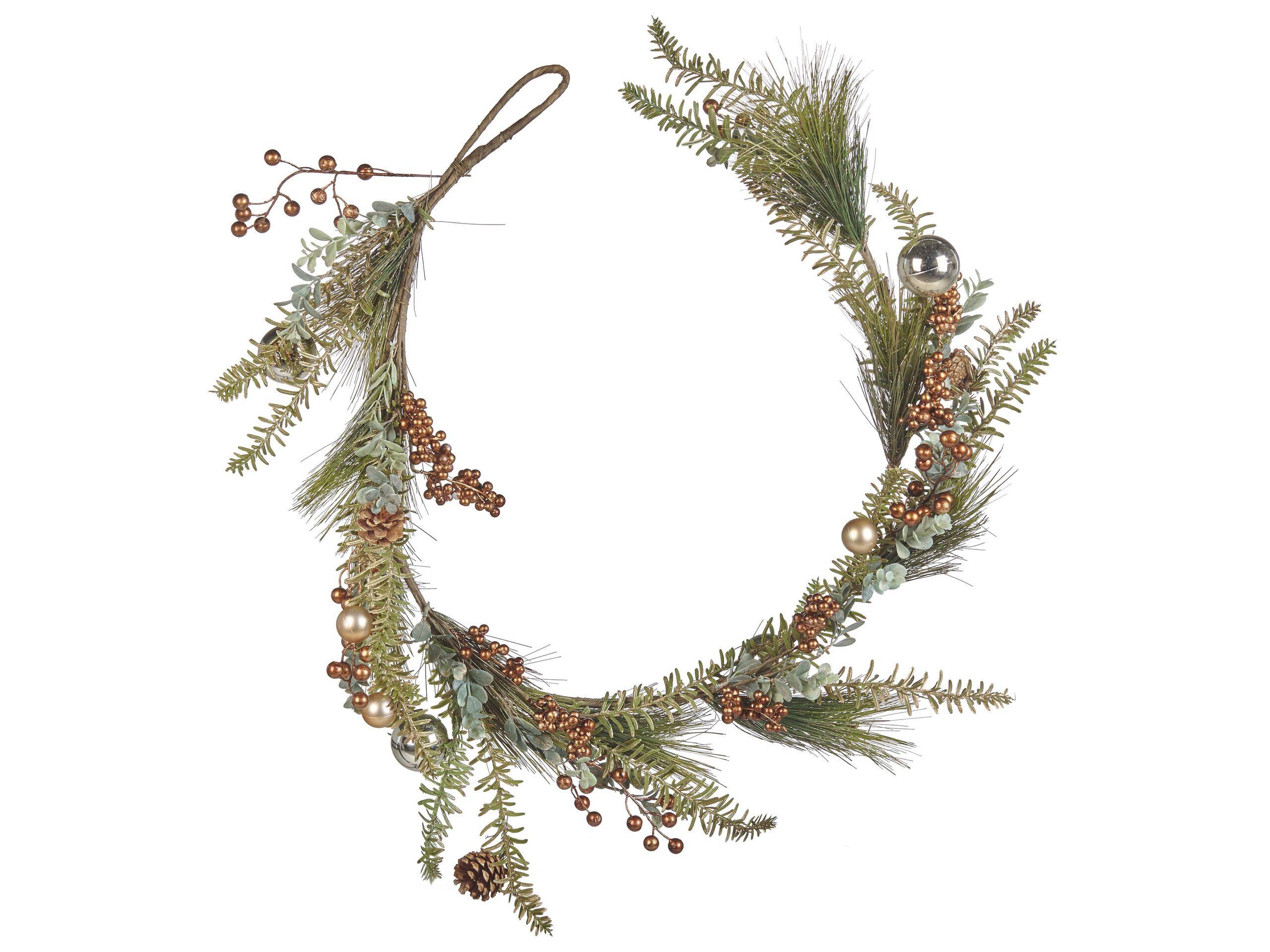 Künstliche Girlande für den Indoor-Bereich. Fühlen Sie die Weihnachtsfreude in Ihrem Zuhause mit minimalistischen Dekorationen, die sich gut in jede Inneneinrichtung einpassen. Die grünen Zweige der Girlande bilden eine schöne Basis für alle Accessoires in einer auffälligen Kupferfarbe. Hängen Sie das Produkt dank des integrierten Aufhängers an die Wand oder stellen Sie es auf einen Tisch und kombinieren Sie es mit anderen Dekorationen, um Ihre eigene einzigartige Weihnachtskomposition zu schaffen.