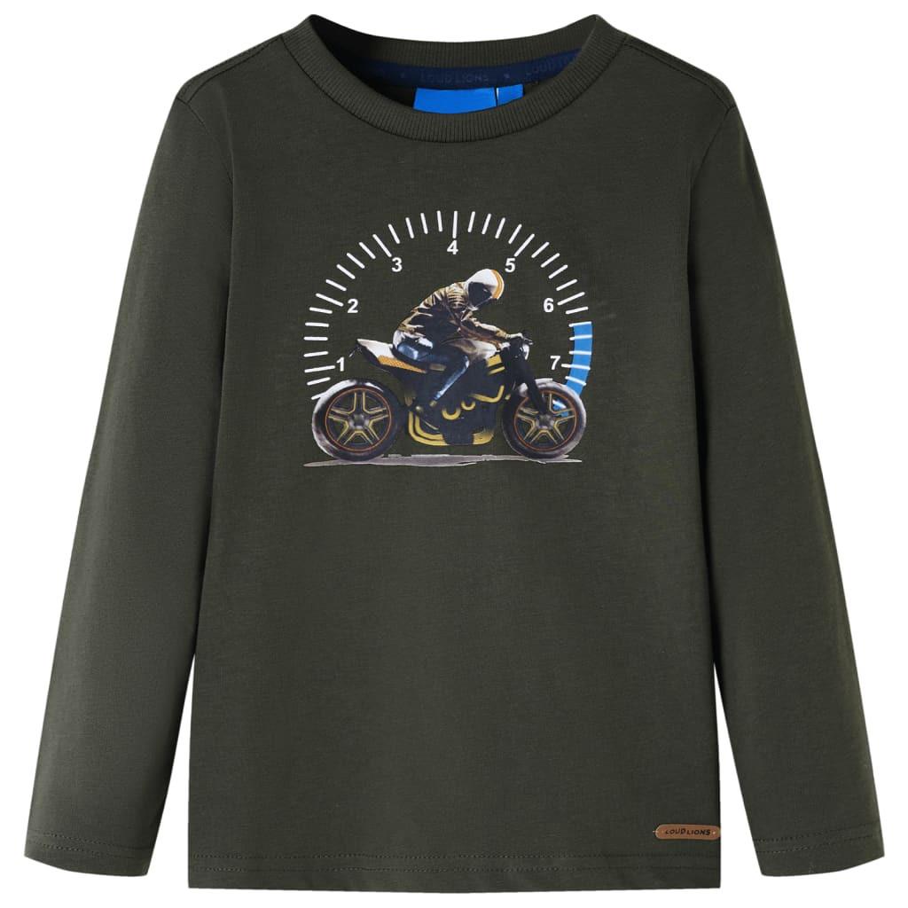 Dieses Kinder-T-Shirt hat lange Ärmel, einen Rundhalsausschnitt und eine gerade Passform. Das T-Shirt in Khaki ist mit einem Mann auf einem Motorrad bedruckt. Das Langarmshirt besteht zu 100 % aus Baumwolle, die mit einer Silikon- und Enzym-Waschung behandelt wurde und sich daher ganz weich und angenehm anfühlt.