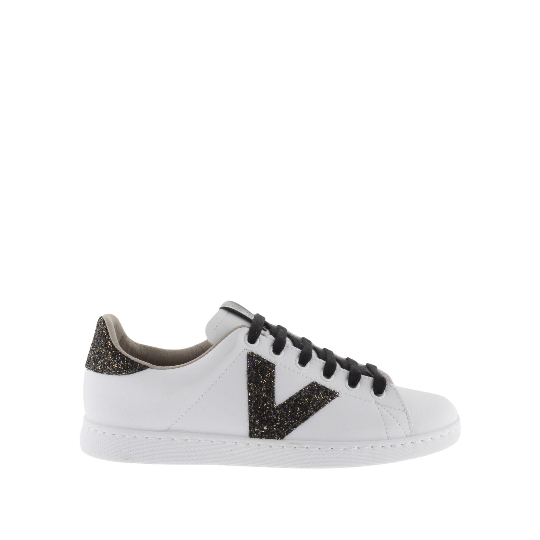 Diese Sportschuhe für Mädchen sind aus weissem veganem Kunstleder mit kontrastierenden Schnürsenkeln gefertigt. Sie verfügen über ein glitzerndes Victoria-Logo an der Seite und eine passende Ferse.