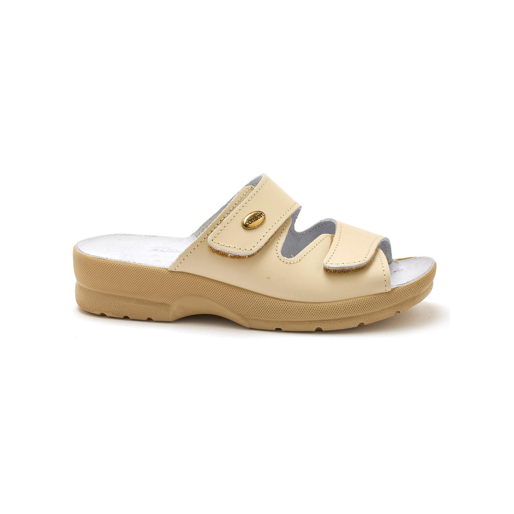 Die Pediconfort Pantoletten wurden speziell entwickelt, um maximalen Komfort zu garantieren. Die anatomische Wölbung folgt dem Relief der Fusswölbung, stützt die Ferse dank ihrer Mulde und verhindert das Rutschen des Fusses für mehr Sicherheit. Das Obermaterial ist dank 2 Klettverschlusslaschen verstellbar.
