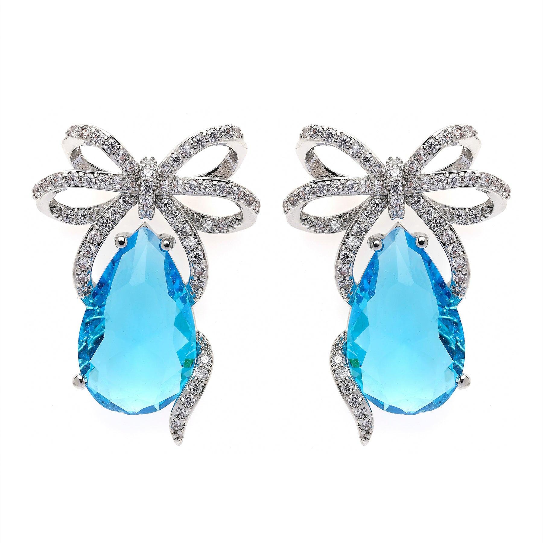Diese bezaubernden Ohrhänger bestechen durch ein verspieltes Zusammenspiel von Glanz und leuchtenden Farben. Eine zarte, mit Kristallen besetzte Schleife thront auf einem strahlenden, tropfenförmigen blauen Edelstein. Die Kombination aus der verspielten Schleife und dem satten Blauton macht sie zu einem hinreißenden und auffälligen Accessoire. Größe: 1,9 cm x 2,8 cm | Beschichtung: Rhodiumplattiert | Verschluss: Stecker und Rückseite