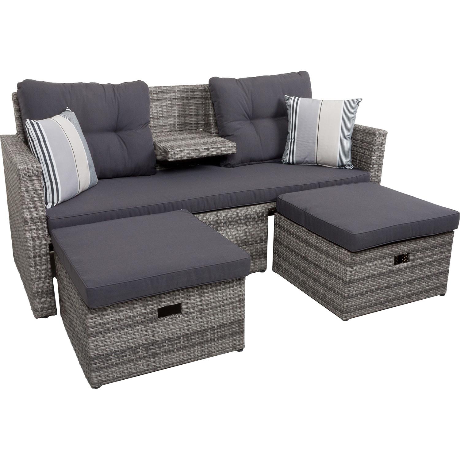 Das Loungesofa Valletta, ein Inbegriff von Stil und Komfort, fügt sich durch sein modernes Design und seine hochwertige Verarbeitung nahtlos in jede Outdoor-Umgebung ein. Mit seinem schwarzen Stahlgestell und dem hellgrauen Kunststoffgeflecht, verleiht es jedem Aussenbereich, sei es Terrasse, Balkon oder Garten, eine elegante und zugleich luftige Note. Dabei steht die robuste und strapazierfähige Materialwahl nicht nur für eine hohe Lebensdauer, sondern garantiert auch eine einfache Pflege und Widerstandsfähigkeit gegenüber Sonneneinstrahlung und Feuchtigkeit. Geliefert wird das Sofa bereits montiert, was eine schnelle und unkomplizierte Nutzung ermöglicht.
