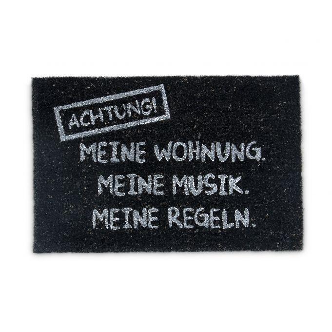 Verschönern Sie Ihren Eingangsbereich mit einer einzigartigen Fußmatte aus Kokosfaser, die Funktionalität und Humor vereint. Diese Fußmatte hält Schmutz fern und sorgt mit ihrer witzigen Botschaft „Achtung! Meine Wohnung. Meine Musik. Meine Regeln.“ für Gesprächsstoff.