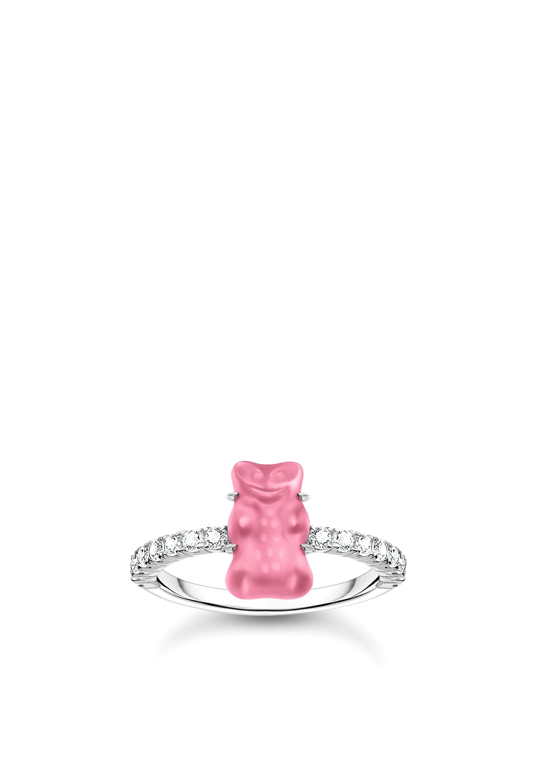 Ring aus recyceltem Silber, zur Hälfte mit weißen Zirkoniasteinen besetzt Mit HARIBO Goldbären aus hochwertigem, bruchsicherem, leicht satiniertem, rosa Kristallglas Mit der Gravur THOMAS SABO x HARIBO auf der Ringschiene und einem sanft abgerundeten Ringschaft für hohen Tragekomfort Zeigen Sie, dass Sie ein Fan der berühmten Goldbären sind - mit diesem Ring aus recyceltem Silber. Der täuschend echt aussehende HARIBO Goldbär ist sein Highlight. Der Bär im Miniformat ist aus hochwertigem, bruchsicherem, leicht satiniertem rosa Kristallglas gefertigt. Das süße Design weckt Kindheitserinnerungen - aber bitte nicht anknabbern ;-) Kombinieren Sie stattdessen diesen funkelnden Ring aus der THOMAS SABO x HARIBO Kollektion mit einem Augenzwinkern zu jedem Outfit - ob elegant oder im Y2K-Style.