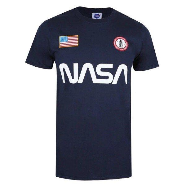 Dieses T-Shirt verfügt über einen klassischen Rundhalsausschnitt und kurze Ärmel und bietet eine bequeme und vielseitige Passform. Die Vorderseite ist mit einem prominenten NASA-Logo, einem amerikanischen Flaggen-Patch und einem kreisförmigen Emblem verziert, was dem Design eine unverwechselbare Note verleiht.
