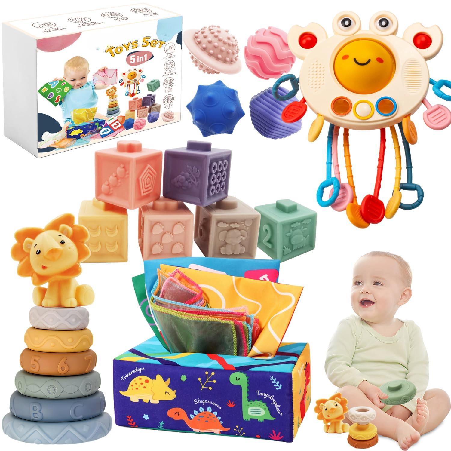 Das Spielzeug ab 6 Monaten ist aus hochwertigem, langlebigem, lebensmittelechtem Silikon und ABS-Material hergestellt. BPA-frei, ungiftig und leicht zu reinigen. Unsere sensorischen Spielzeuge sind weich und einfach für Babys zu kauen und zu spielen. Die Spielzeuge ab 1 Jahr helfen Babys bei der Entwicklung ihrer motorischen und geistigen Fähigkeiten und sind ein sicherer Begleiter für ihr Wachstum. Das Babyspielzeug ab 3 Monaten ist für Jungen und Mädchen geeignet. Das sensorische Babyspielzeug Krabbe besteht aus einem Knopfball und einem Blasenpop. Es ermutigt Kleinkinder, ihre Greifkraft zu trainieren, bietet aber auch ein sicheres und befriedigendes Objekt zum Kauen. Die Tissue-Box enthält 3 verschiedene Themen-Papiere und 10 bunte Taschentuchschals. Sie lockt Kinder mit leuchtenden Farben und knisternden Geräuschen an, was ihre Feinmotorik fördert und ihre frühe Wahrnehmung schult. Unser sensorisches Aktivitätsspielzeug besteht aus 6 weichen Bausteinen, 6 Stapelringen mit Löwenspielzeug und 4 Quetschbällen. Es ist kaubar, stapelbar und quetschbar und damit ideal für zahnende Babys. Der Stapelspiel-Motorikwürfel zeigt geprägte Tiere, Früchte, arabische Ziffern, geometrische Muster und Grafiken. Für Babyspielzeug ab 6, 9, 12, 18 Monaten, Training Stapeln und Paarung Fähigkeiten können ihre Feinmotorik zu entwickeln Das Spielzeugset soll die Kreativität und Intelligenz von Babys fördern und Ihrem Kind eine fröhliche und multisensorische Erfahrung bieten. Größe:12,7 x 5,1 x 6,9