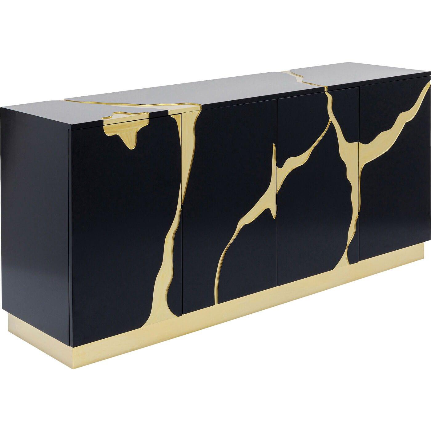 Dieses Sideboard bringt den gewissen Kick in Ihren Wohnraum! Mit dem einzigartigen Design des goldenen Sockels und den goldenen Linien entsteht der Eindruck, dass die schwarze Verkleidung von einem Objektkünstler ein Finish bekommen hat. Absolut kreativ und ein toller Blickfang! Das Sideboard im Luxus Look kann auch als Alternative zum TV Board genutzt werden und bietet nebenbei mit vier verstellbaren Einlegeböden genug Stauraum. Durch die praktische Push to open Funktion können Sie die Türen ohne Griffe öffnen, wodurch das Gesamtbild des modernen und cleanen Sideboards bestehen bleibt.Schwarz-goldenes SideboardAusfallendes Design mit eingefrästen fliessenden Dekor-Linien in GoldEyecatcher und luxuriöses Wohn-Upgrade für Ihre vier WändeBequemes Öffnen durch leichten Druck dank Push to open FunktionMöbel wird fertig montiert geliefertProduktinformation Korpus: mitteldichte Faserplatte lackiert (Intarsien lackiert), Sockel: Stahl pulverbeschichtet, Intarsien: Teilweise Handarbeit, 100 kg max. Belastbarkeit, montiert, push-to-open
