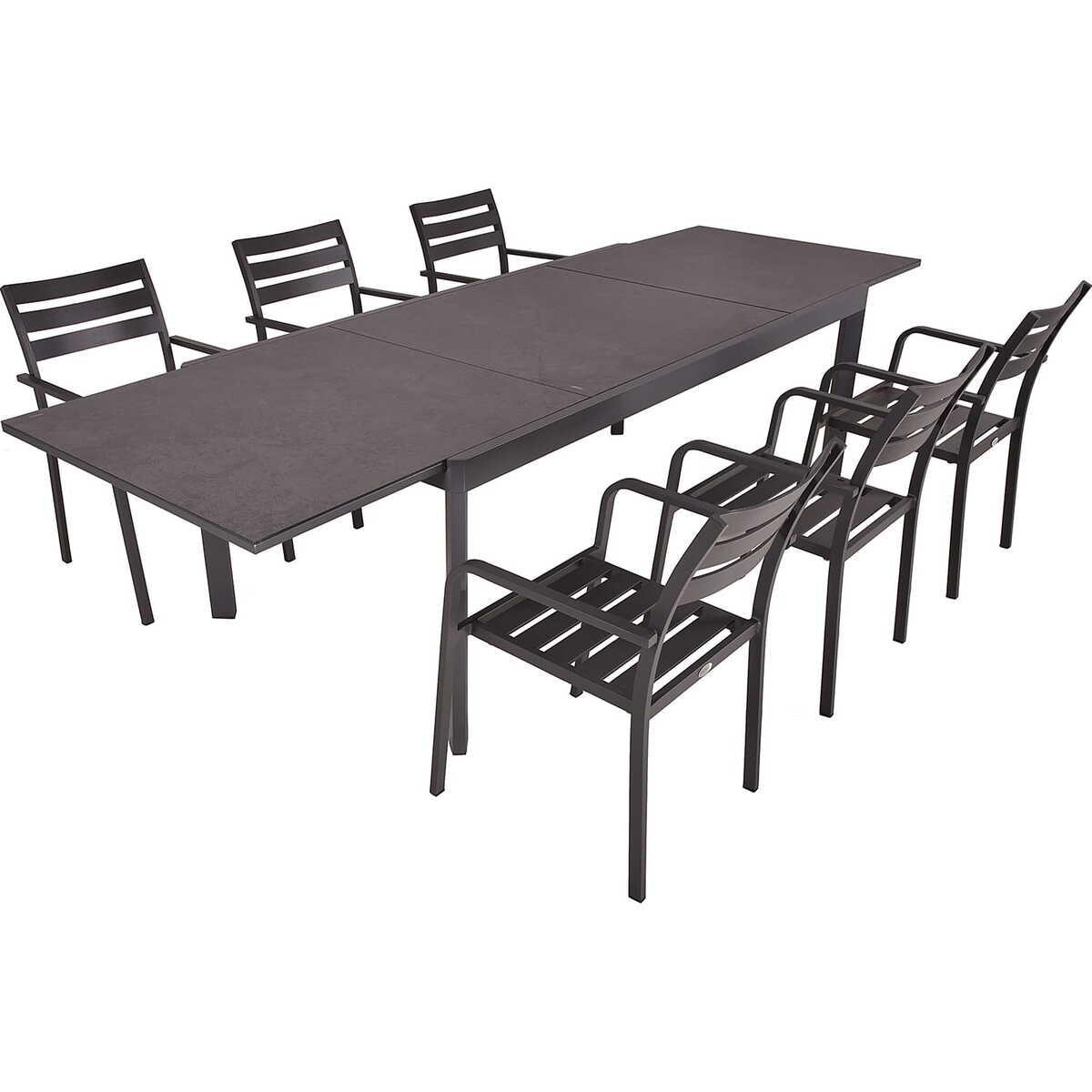 Set besteht aus einem ausziehbaren Nerea-Tisch und acht Treviso-Stühlen Tischgestell aus robustem, pulverbeschichtetem Anthrazit-Aluminium Glasplatte in Keramik-Optik bietet Langlebigkeit und Eleganz Integrierter Ausziehmechanismus für flexible Anpassung der Tischgrösse Treviso-Stühle mit leichtem, stabilem Aluminiumgestell Stühle können für platzsparende Lagerung gestapelt werden Maximale Belastbarkeit der Stühle: 110kg, Tisch: 40kg Zeitgemässes Design, das in jedem Raum zum Hingucker wird
